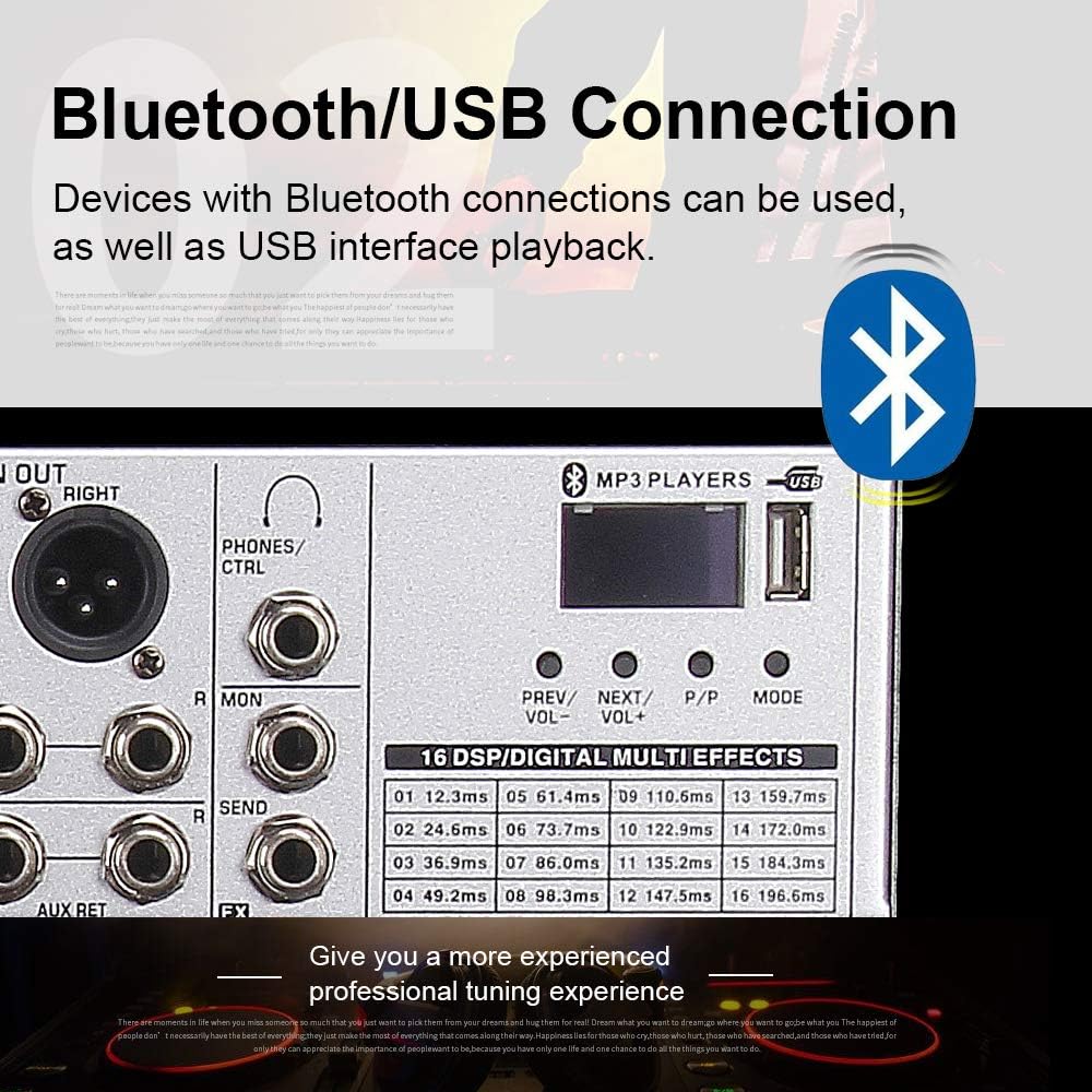 - 【Advanced 12-Channel Audio Mixing】 The DJ Mixing Console is a professional-grade sound mixer, low noise, high headroom analog mixer State-of-the-art 48V phantom-powered mic Mixer has 8 mono channels and 4 stereo inputs.12 inputs with mic preamp and compressor, British EQ, 16-bits multi-effects processor and USB/audio interface,ensuring optimal audio clarity