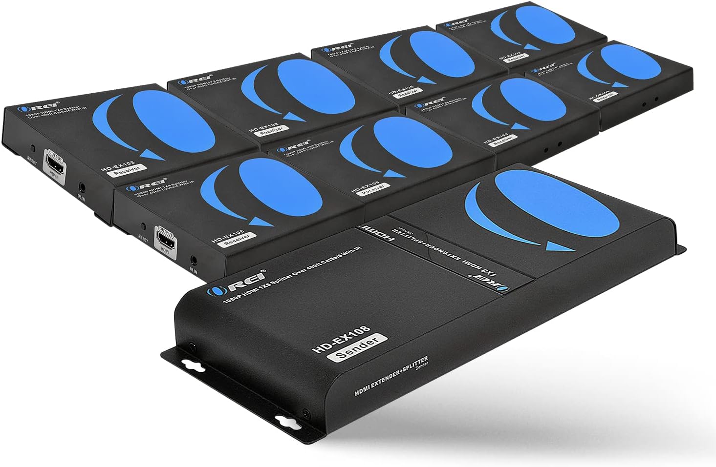 - Includes: 1 x Transmitter, 8 x Receivers, 9 x Power Adapter, 1 x IR Blaster Cable, 8 x IR Receiver Cables, 1 x User Manual. 1 Year OREI Manufacturer's Warranty