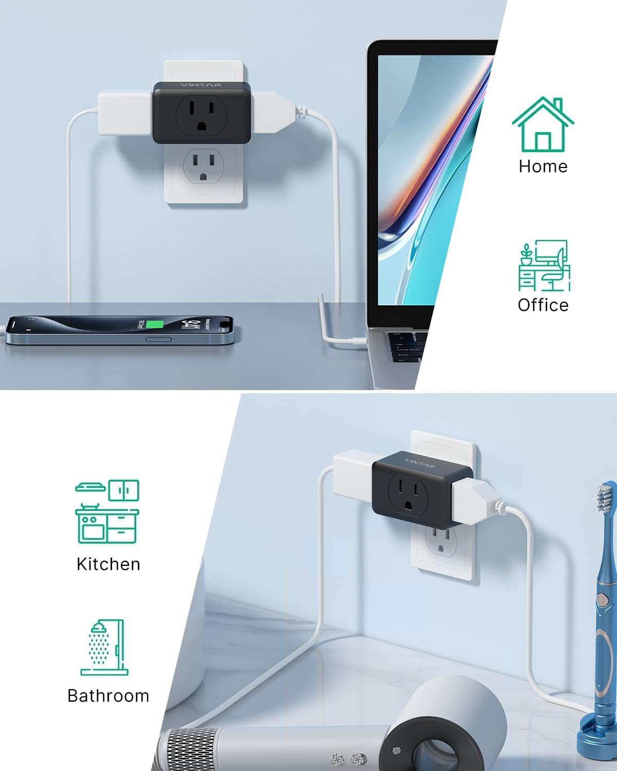 - Space Saving: This electrical outlet extender is mini size: 2.5 x 1.5 x 1.2 in, compact and lightweight design fit into luggage and briefcases. This plug splitter occupies only a single outlet on your wall panel, put on the top outlet and you still have enough room to be used, perfect for indoor use or even travel. Keep less tangle of cords in the bedroom, dorm, office and living room