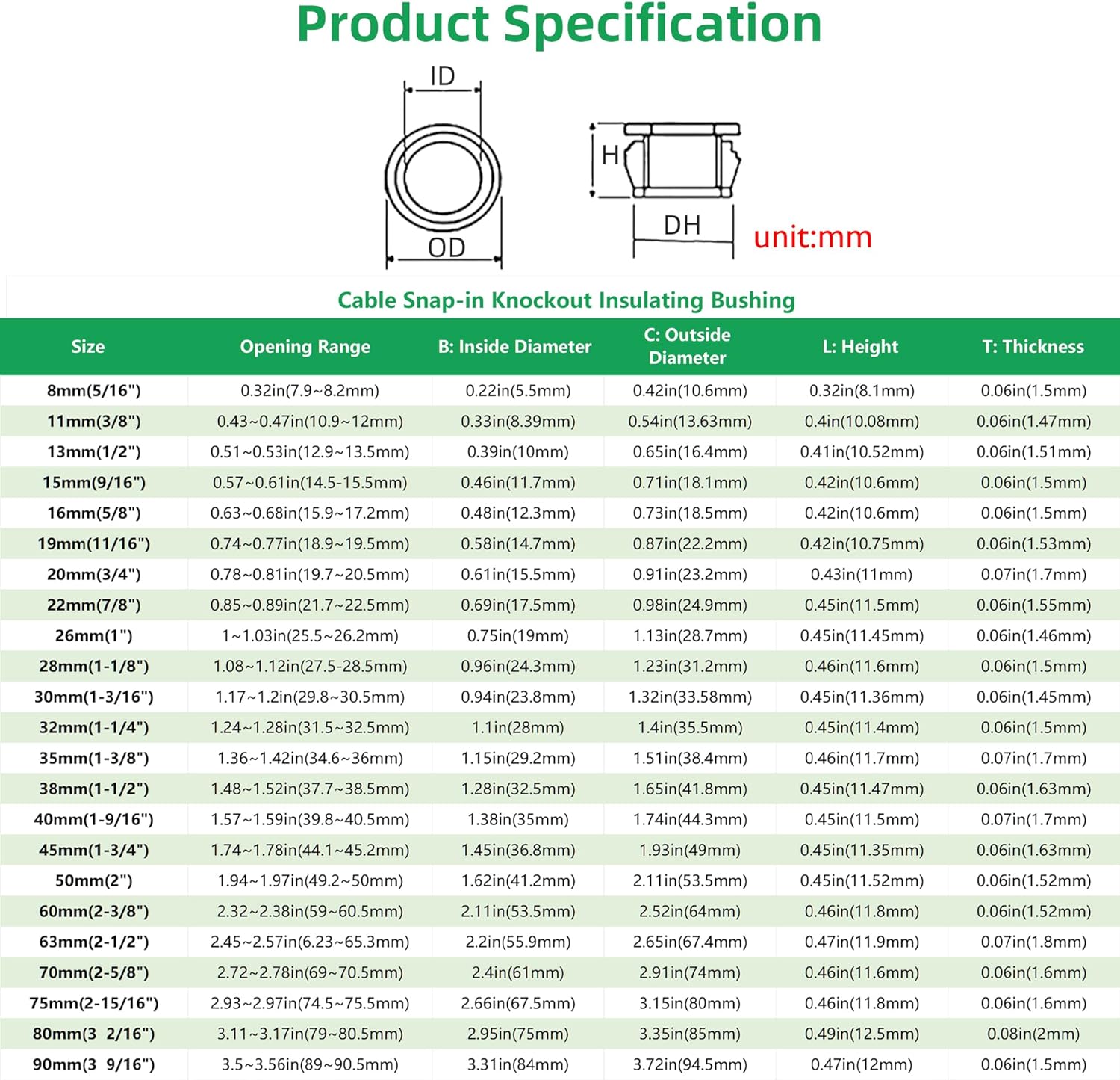 - PACKAGE&SIZE: You will got 8pcs of black snap-in knockout bushing for this package with Mounting Dia: 1 3/4"; Fits hole diameter: 1.74~1.78in(44.1~45.2mm); Inner Dia: 1.45in(36.8mm); Outer Dia: 1.93in(49mm); Height: 0.45in(11.35mm)