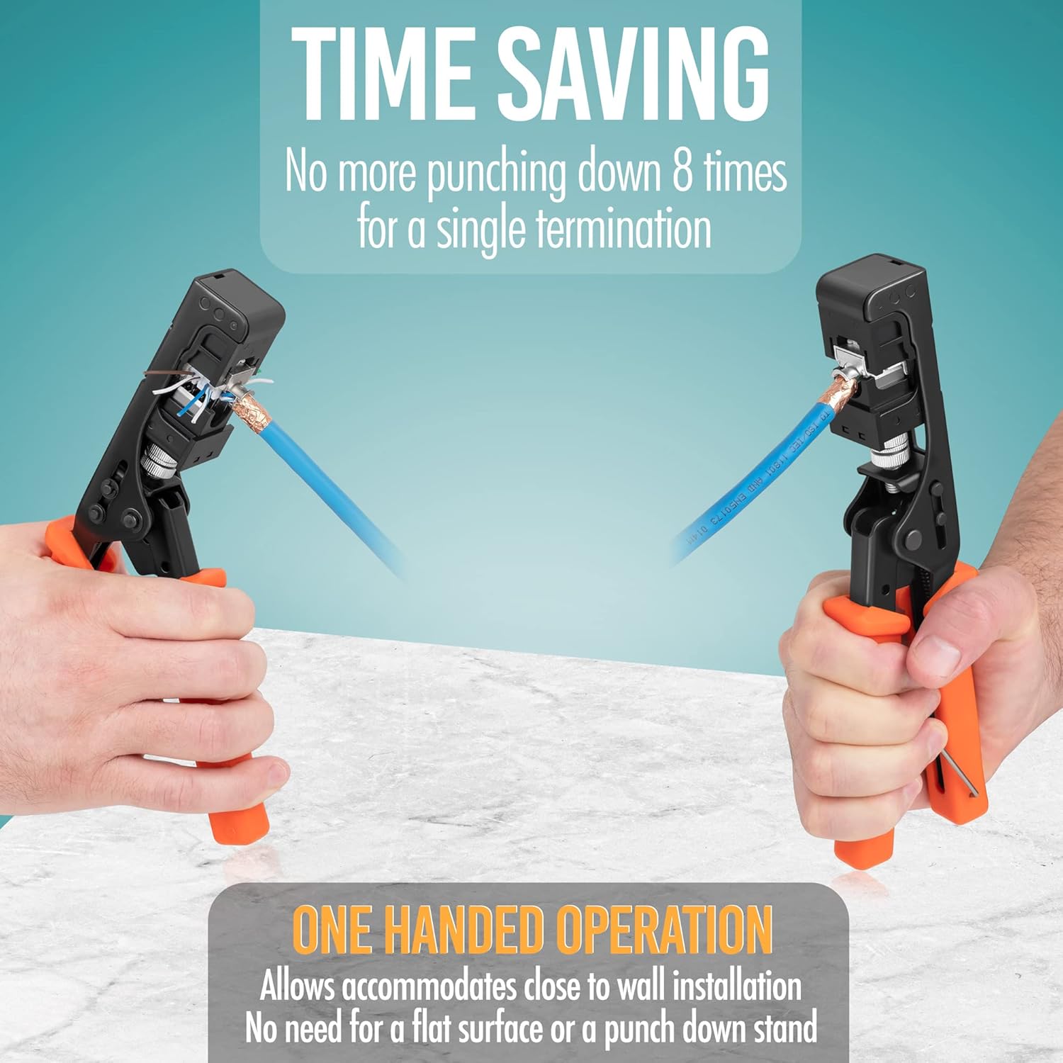 - Efficient Termination - Terminate your RJ45 cables twice as fastβno need to individually punch down wires. Seat and terminate all wires in one smooth motion, with clean cuts and no frayed ends!