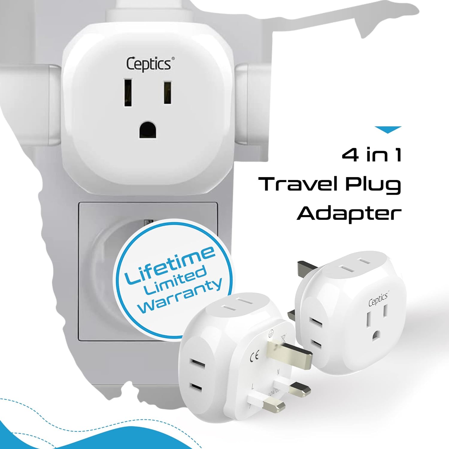 Ceptics US to UK Plug Adapter UK, Ireland Power Adapter Charger 4 Input - Ultra Compact - Light Weight - USA to Any Type G Countries Such as Hong Kong, England and More - 2 Pack (PT-7), White