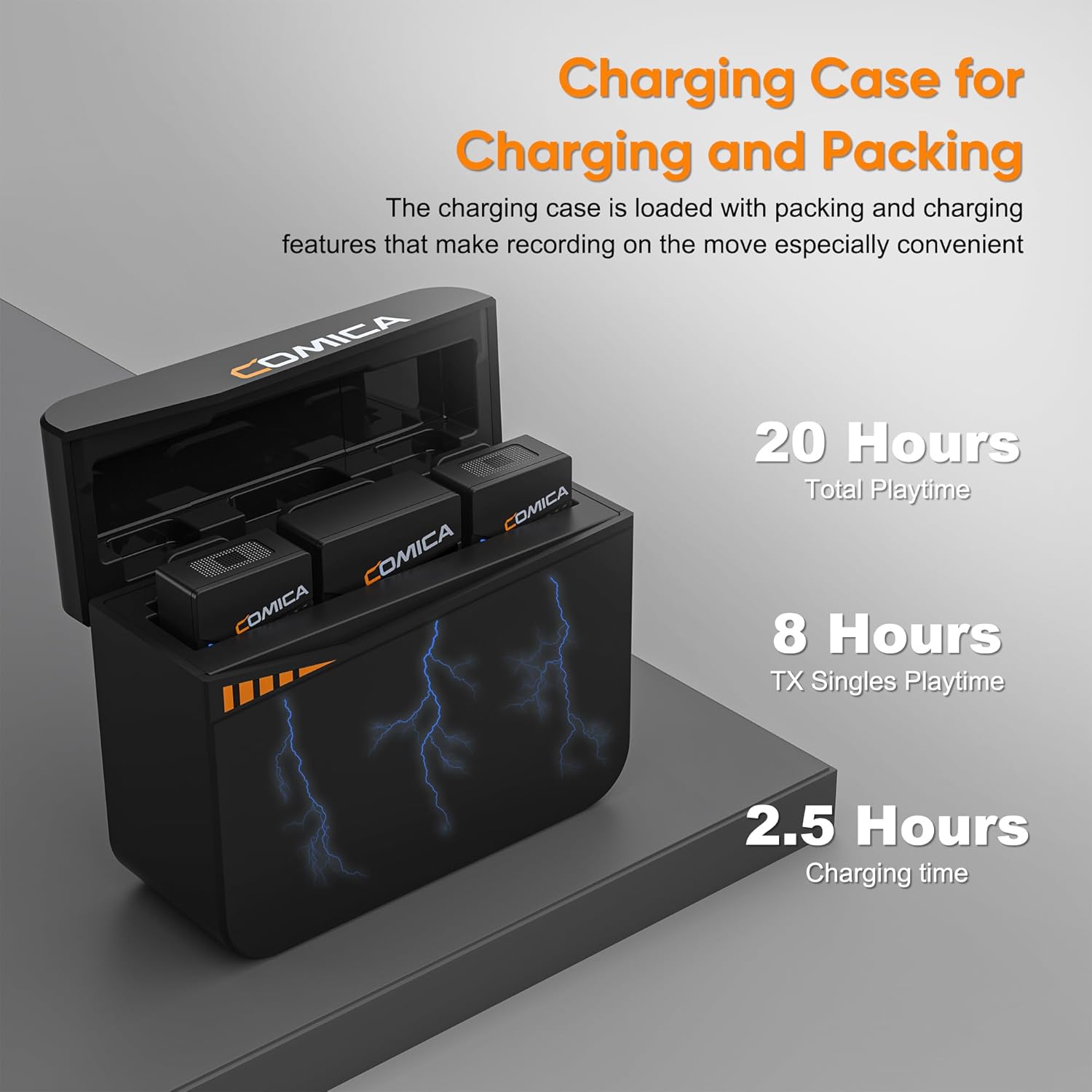 - ăCharging Case for Charging and PackingăThe charging case is loaded with packing and charging features that make recording on the move especially convenient. The mic will be on and paired automatically as soon as you open the case. Its extended battery life lets you record up to 8 hours using only the RX and TX, and up to 20 hours using the case.