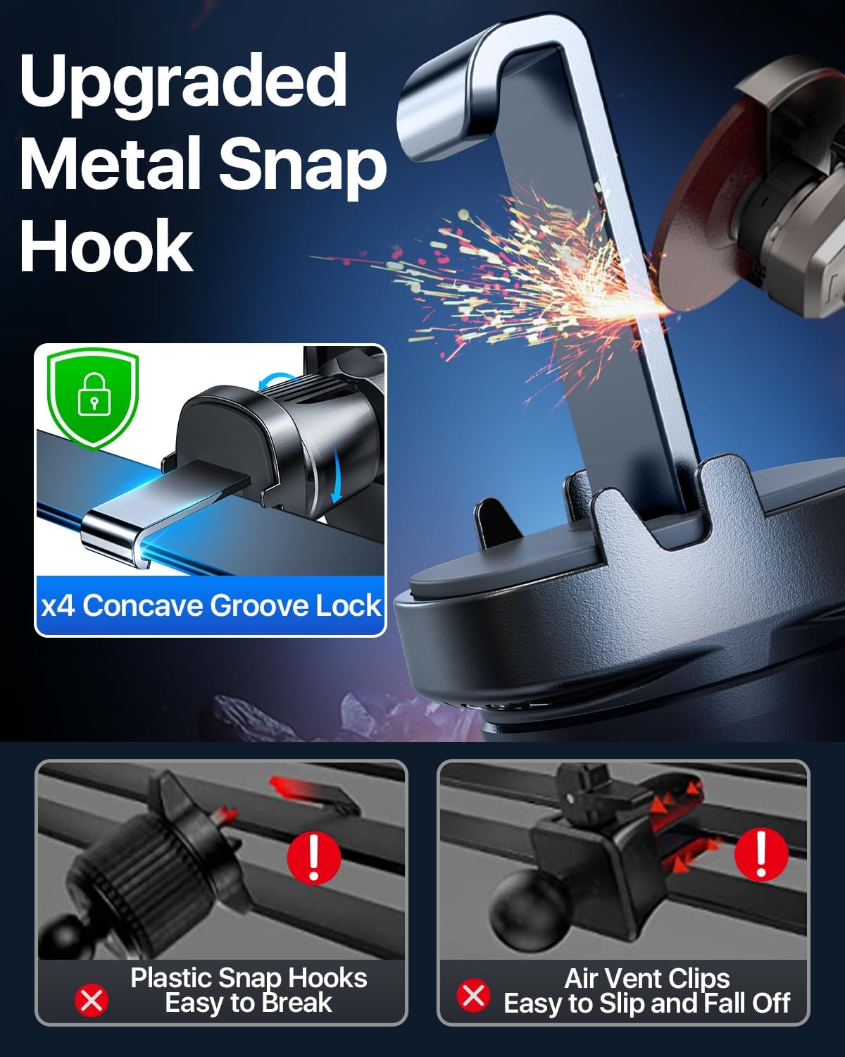 - INNOVATIVE DESIGN & EXTRA PROTECTION: Integrated with a locking reminder device that prevents over-fastening, providing extra vents/mount protection. Steel Hook is more durable and has no sharp edges. Multi-layered silicone pads protect your phone and vent fins from being scratched