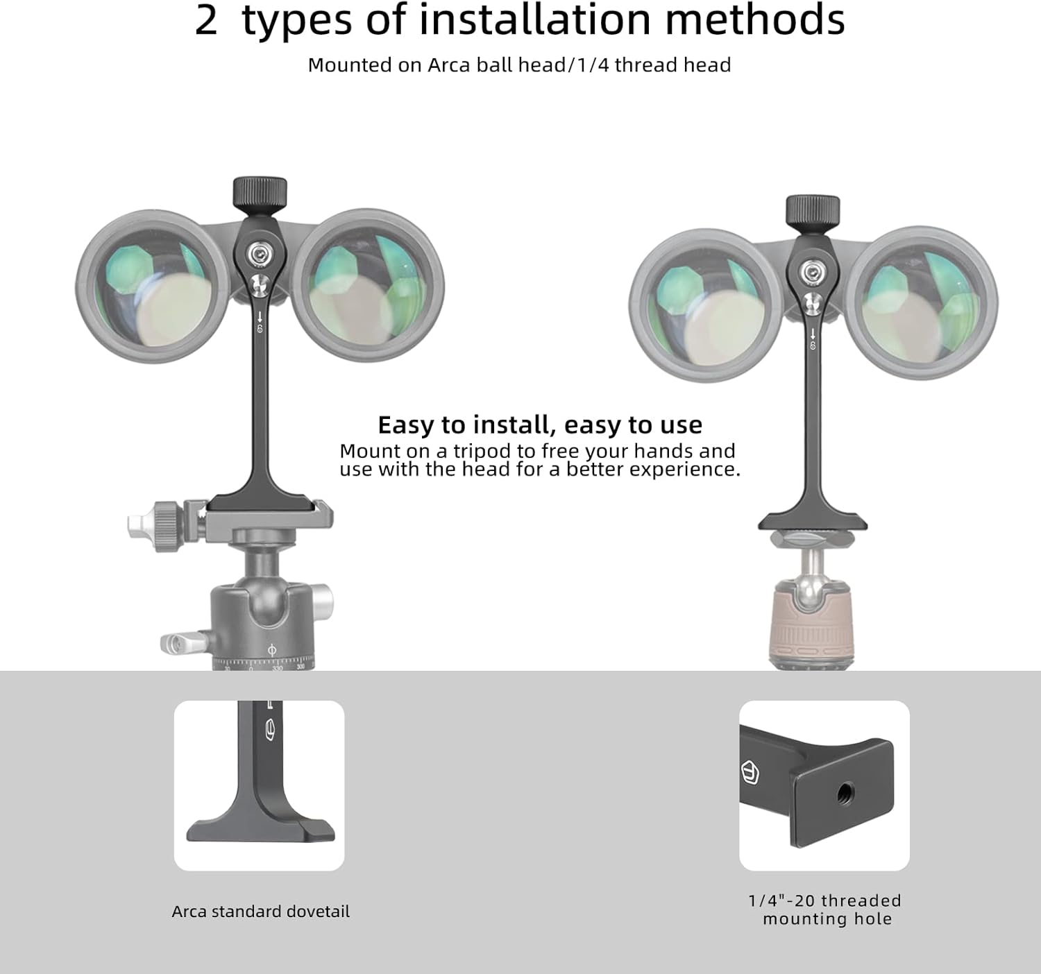 - 【Good Compatibility】The Binocular Tripod Adapter has a Arca-swiss mount and 1/4"-20 thread bottom screw hole and fits most binoculars and standard tripods.