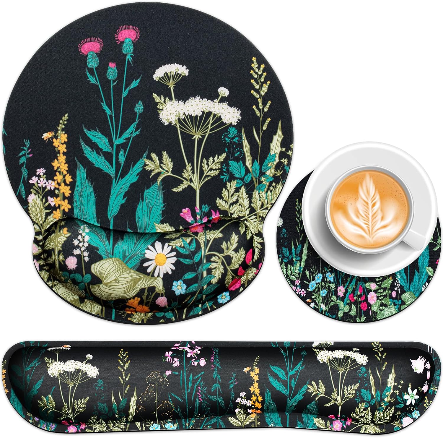 Mouse Pad with Wrist Rest Set, Qomolama 3-in-1 Wrist Support Mouse Pad Set, Floral Gaming Mousepad with Anti-Skid Base,Ergonomic Mouse Pad,Memory Foam Keyboard Gel Wrist Rest