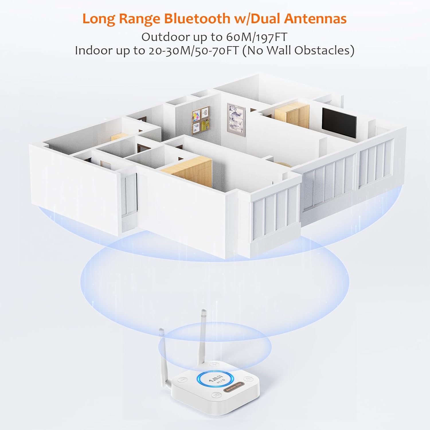 - ăDUAL ANTENNAS LONG RANGEăWith dual antennas and class 1 Bluetooth technology ensure that the 1Mii B06Pro Long Range Bluetooth receiver can achieve a range of up to 197ft line-of-sight in the open air and up to 50-70ft indoors(without obstacles). NOTE: operation range can be affected by WiFi routers or antennas on the stereo receiver, etc.
