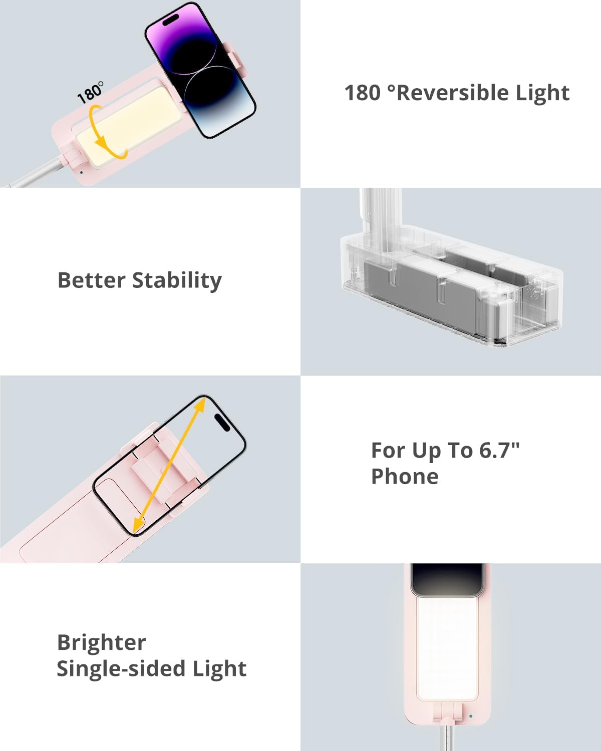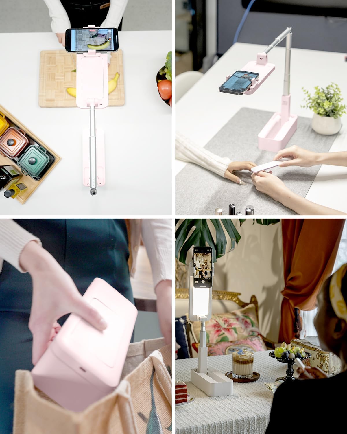 - 【Versatile Extendable & Rotatable Light】 The main pole extends up to 27 inches for flexible height adjustments. The 360-degree rotatable phone holder and 180-degree reversible LED light provide full-angle versatility for desktop shooting.