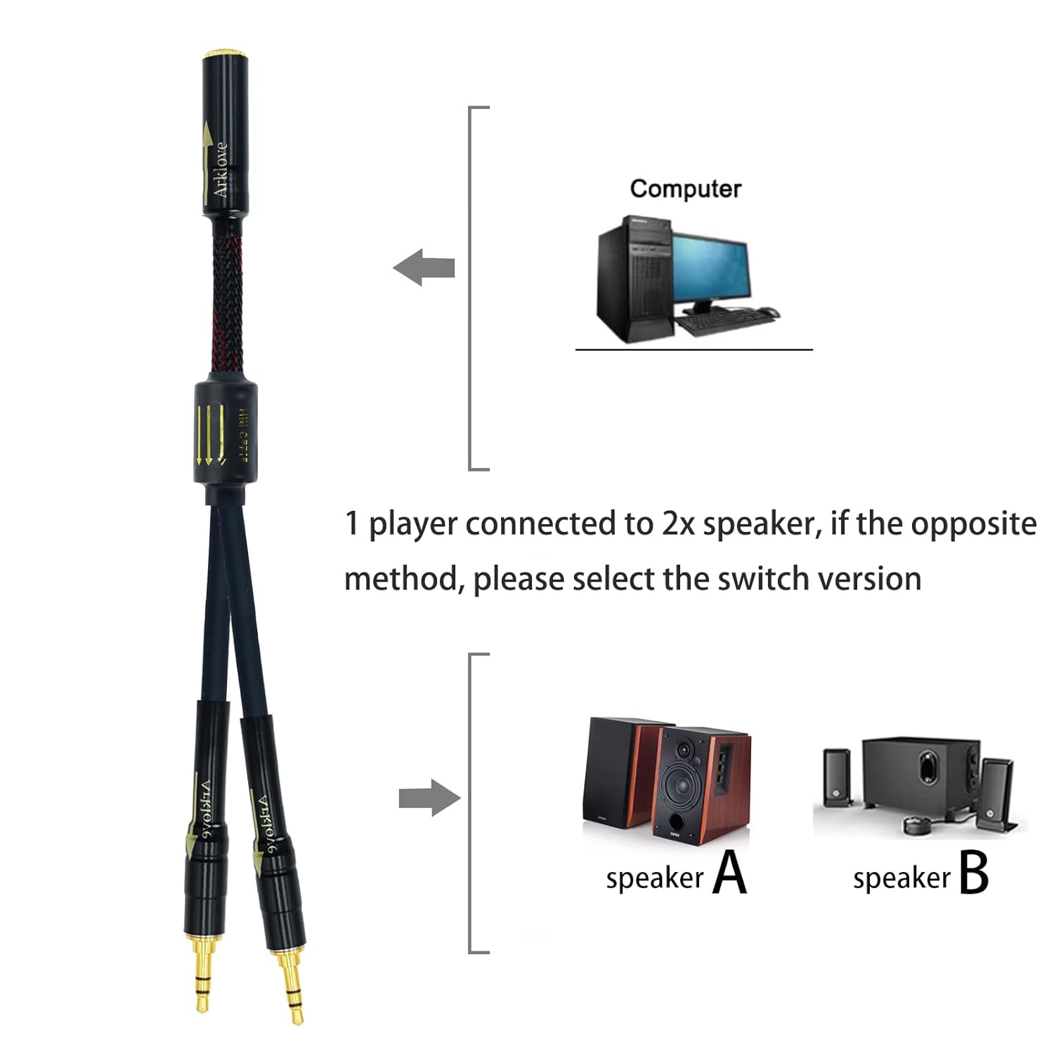 Arklove 10ft Shielded 1/8" aux Input 3.5mm Female to 2X 3.5 Output Splitter Stereo Audio Video Cable Out 3.5 Male to Two 3.5 Male in Dual Speaker Cord 24k Gold Plated