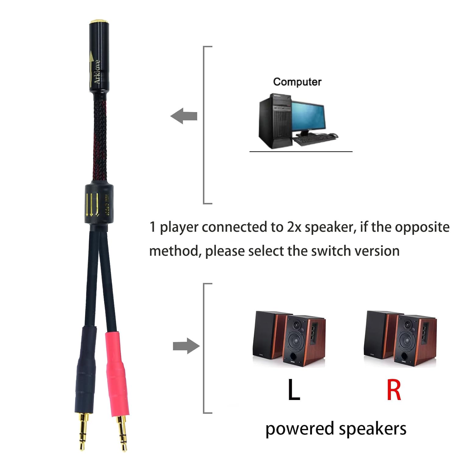 Arklove 10ft Shielded 1/8" aux Input 3.5mm Female to 2X 3.5 Output Splitter Stereo Audio Video Cable Out 3.5 Male to Two 3.5 Male in Dual Speaker Cord 24k Gold Plated Cord