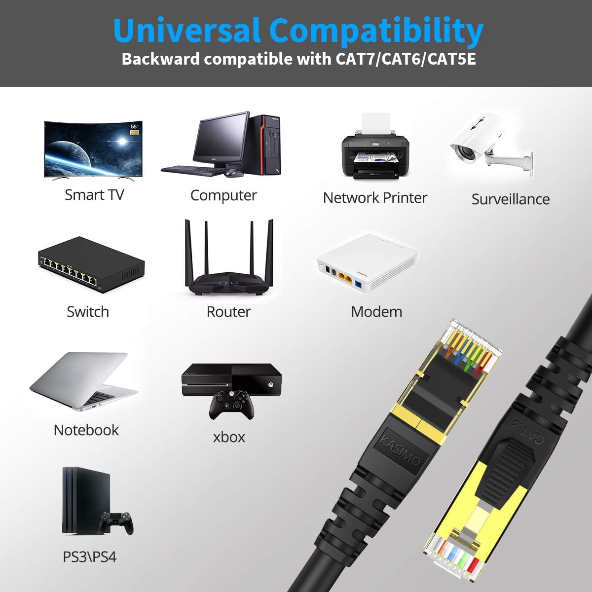 - ā RANGE OF APPLICATION: KASIMO CAT 8 Ethernet patch cable good for Routers, Xbox360, Network Printers, Computer data center, Cloud server center, Cloud server, Enterprise Server and Enterprise Ethernet switches and more.