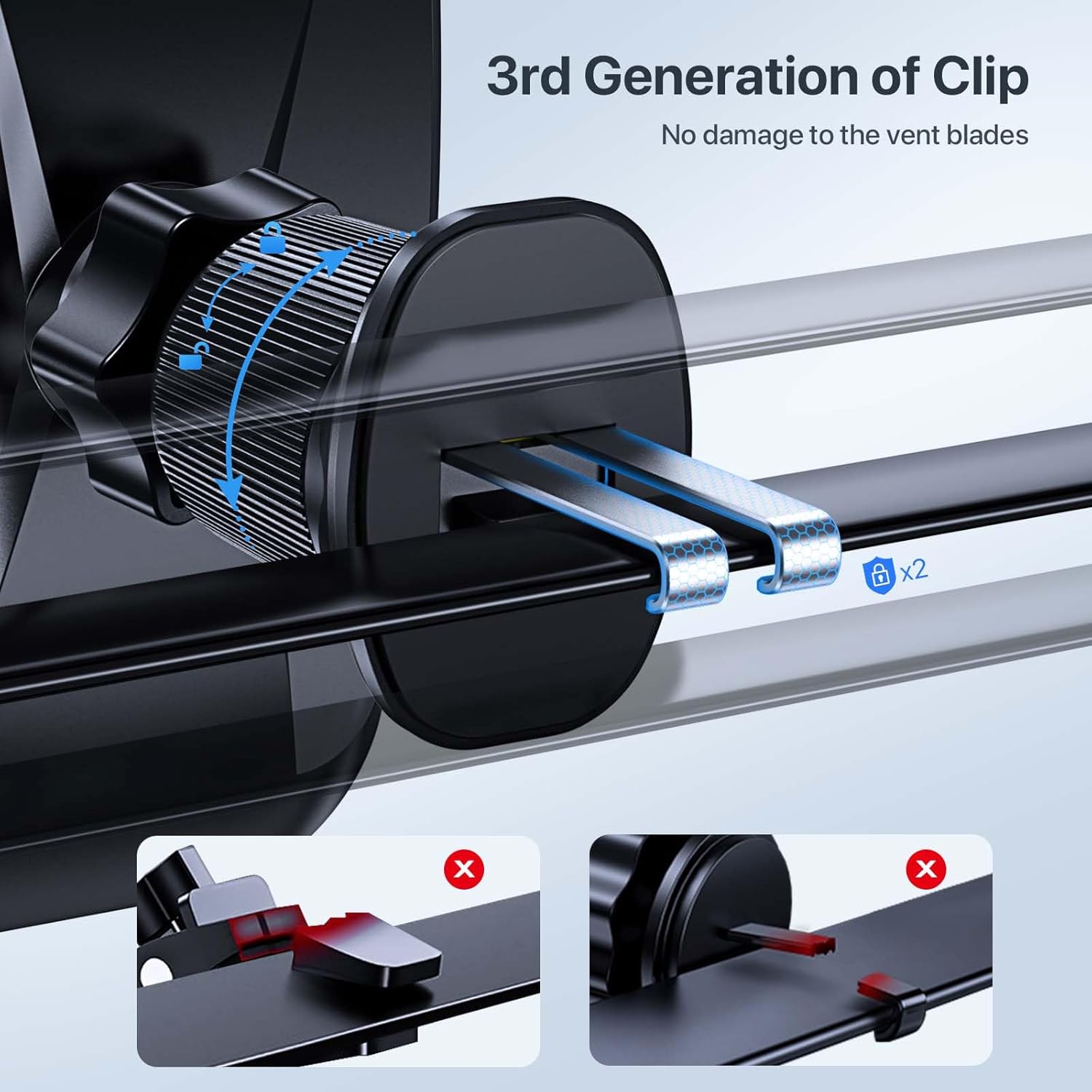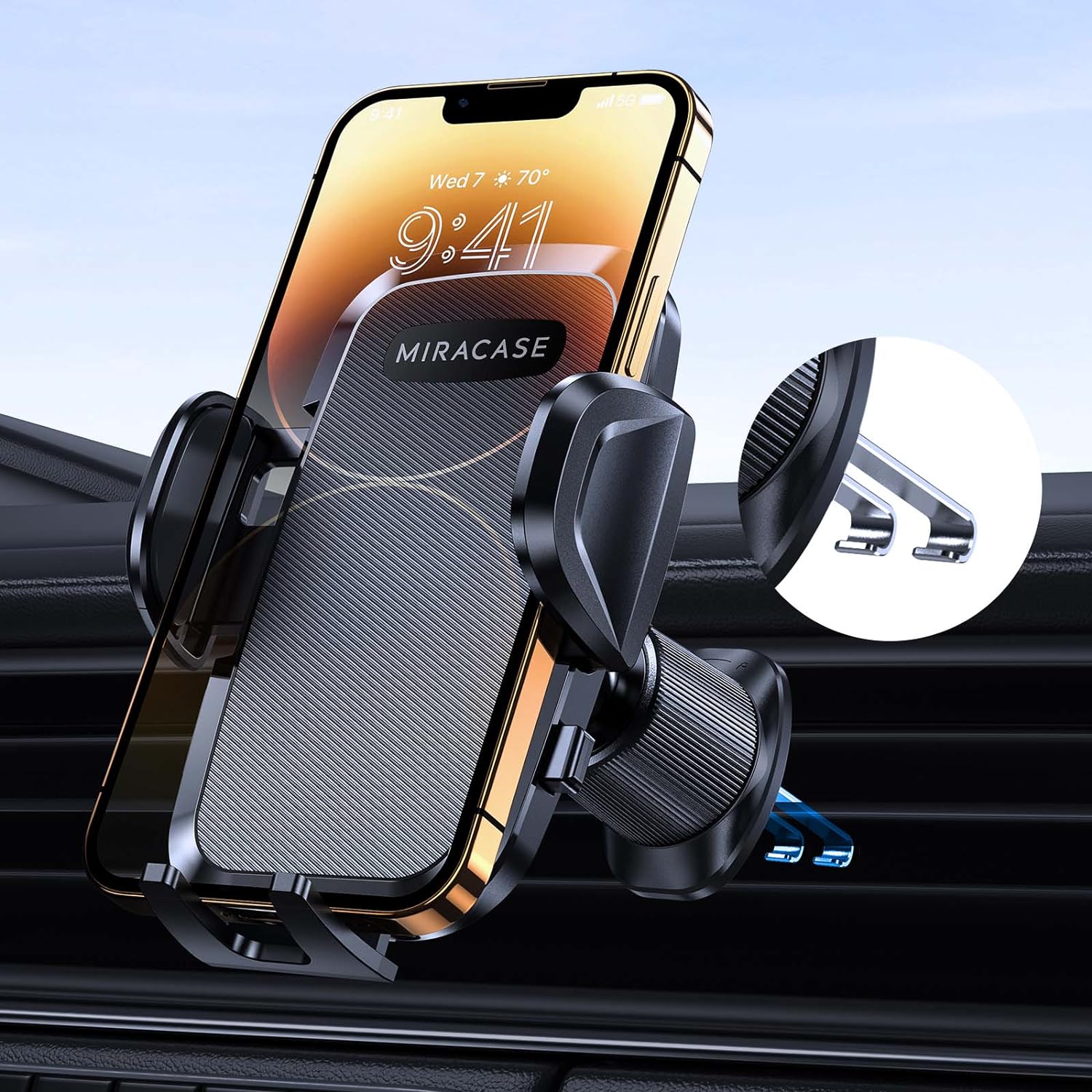 - Never Fall Off-Metal Hook Design: Miracase car phone holder adopts simplified locking design. Upgraded 3rd generation double steel metal hook(with silicone pad and mat) will catch one of car air vent blades and provide excellent strudiness. It will work well for your car even in extremely harsh environments. NOTE: ONLY compatible with horizontal and vertical vents. Not suitable for round vents.