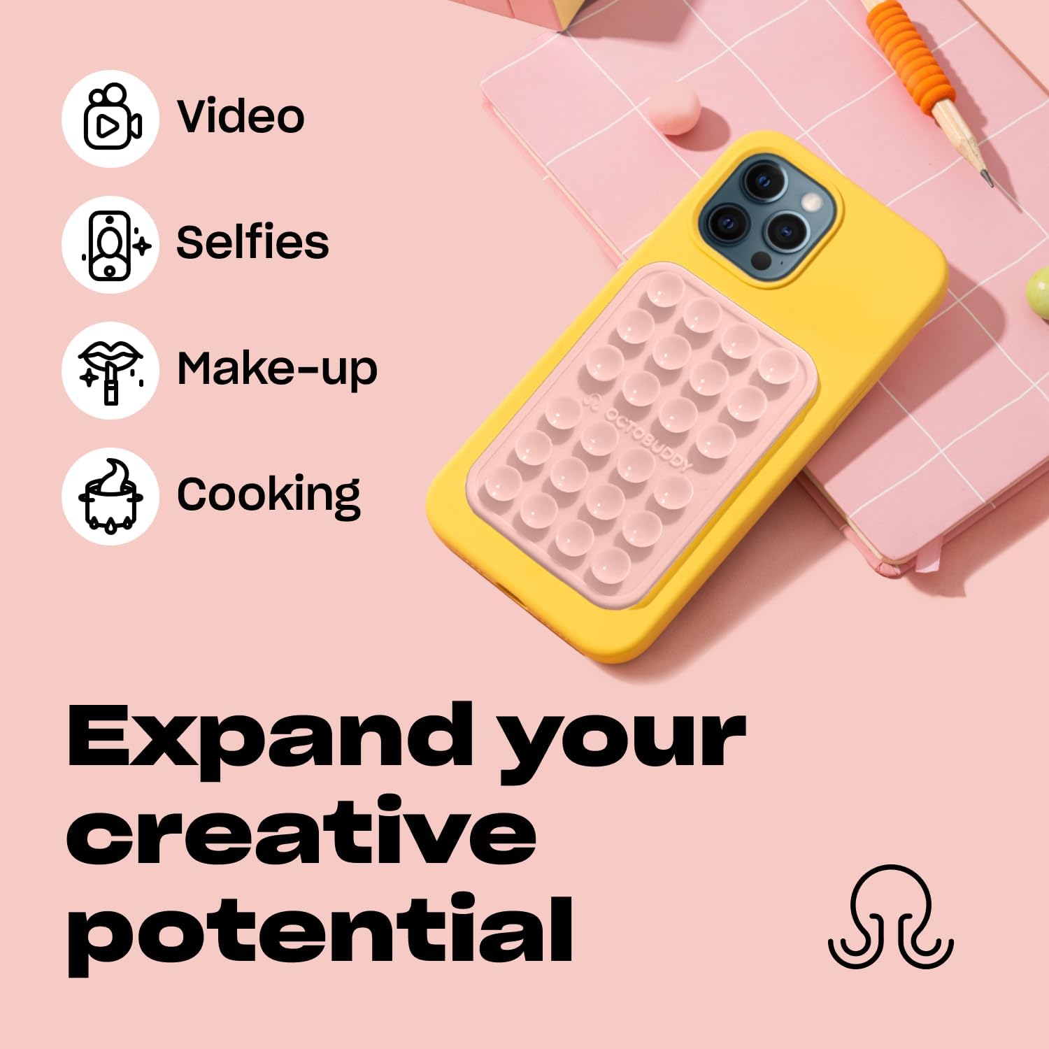 - A revolution in content creation: 24 suction cups grip mirrors, windows, and any smooth surface for steady, hands-free video and selfies with your larger smartphone
