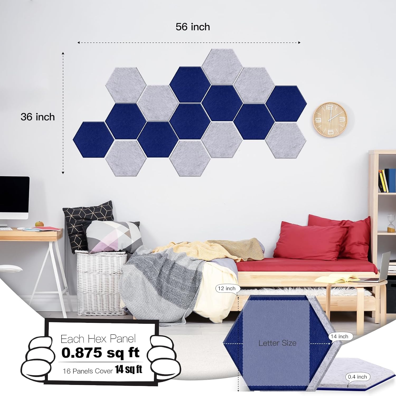 Mollywell Hexagon Acoustic Panels, High Density, Soundproofing, Decorative Noise Reduction Felt Wall Tiles for Ceilings, Home Office & Gaming Room (Navy Blue and Silver Grey), 14x12x0.4 Inch