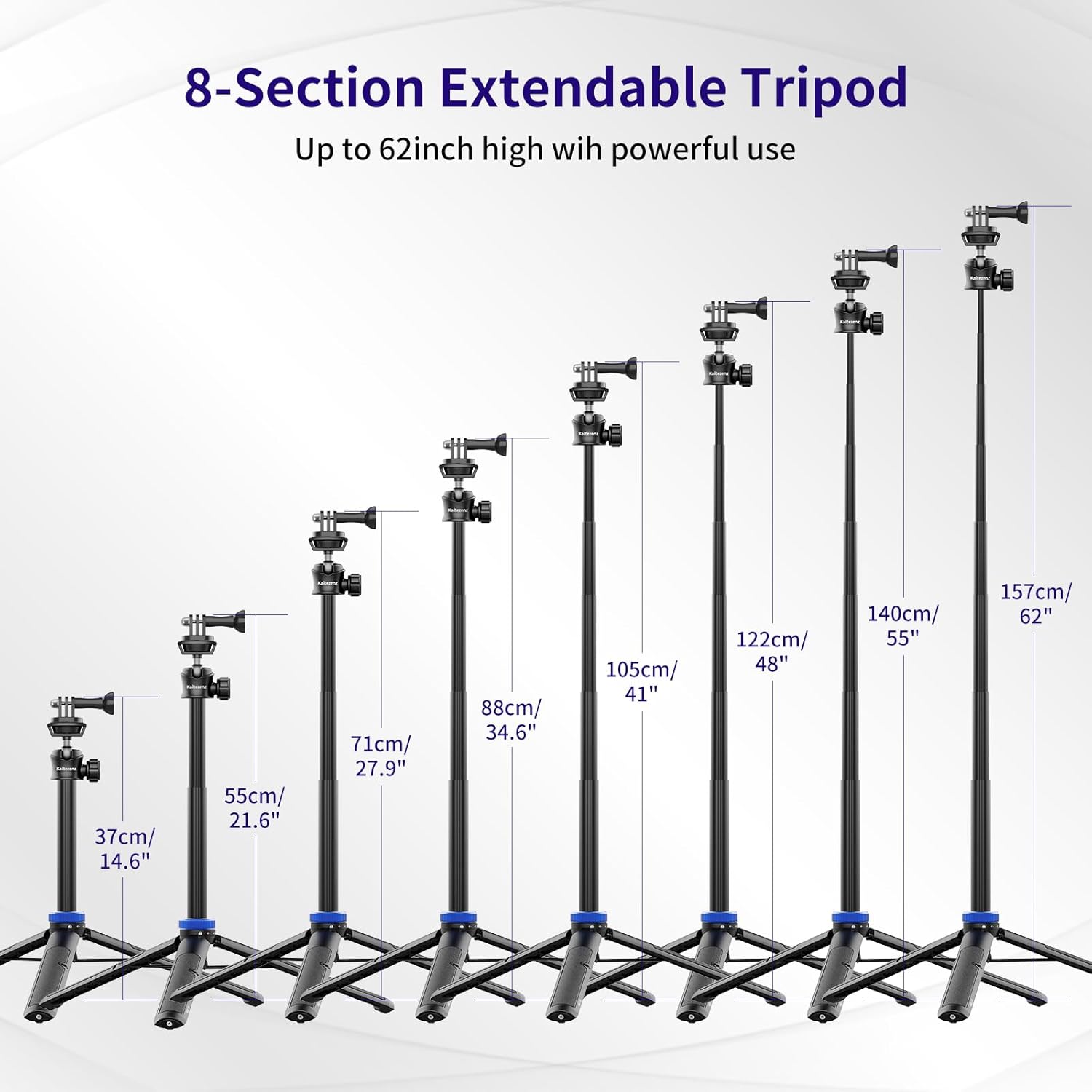 - ▶【62inch Camera Tripod for Gopro】8 sections retractable height adjustment up to 62in. KT-1004 Selfie Stick Tripod, from 32.5cm/12.7 into 157cm/62in, Extremely silky smooth to stretch, strong support when extended in 8 lengths, can meet all your shooting needs.