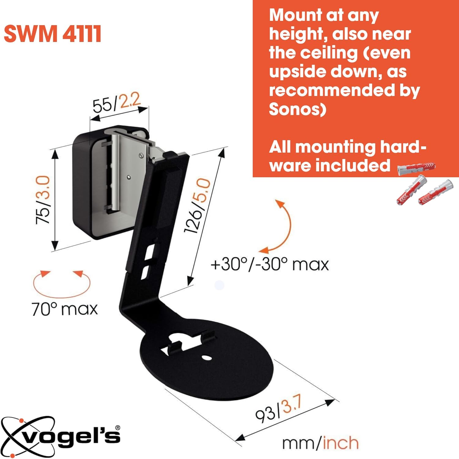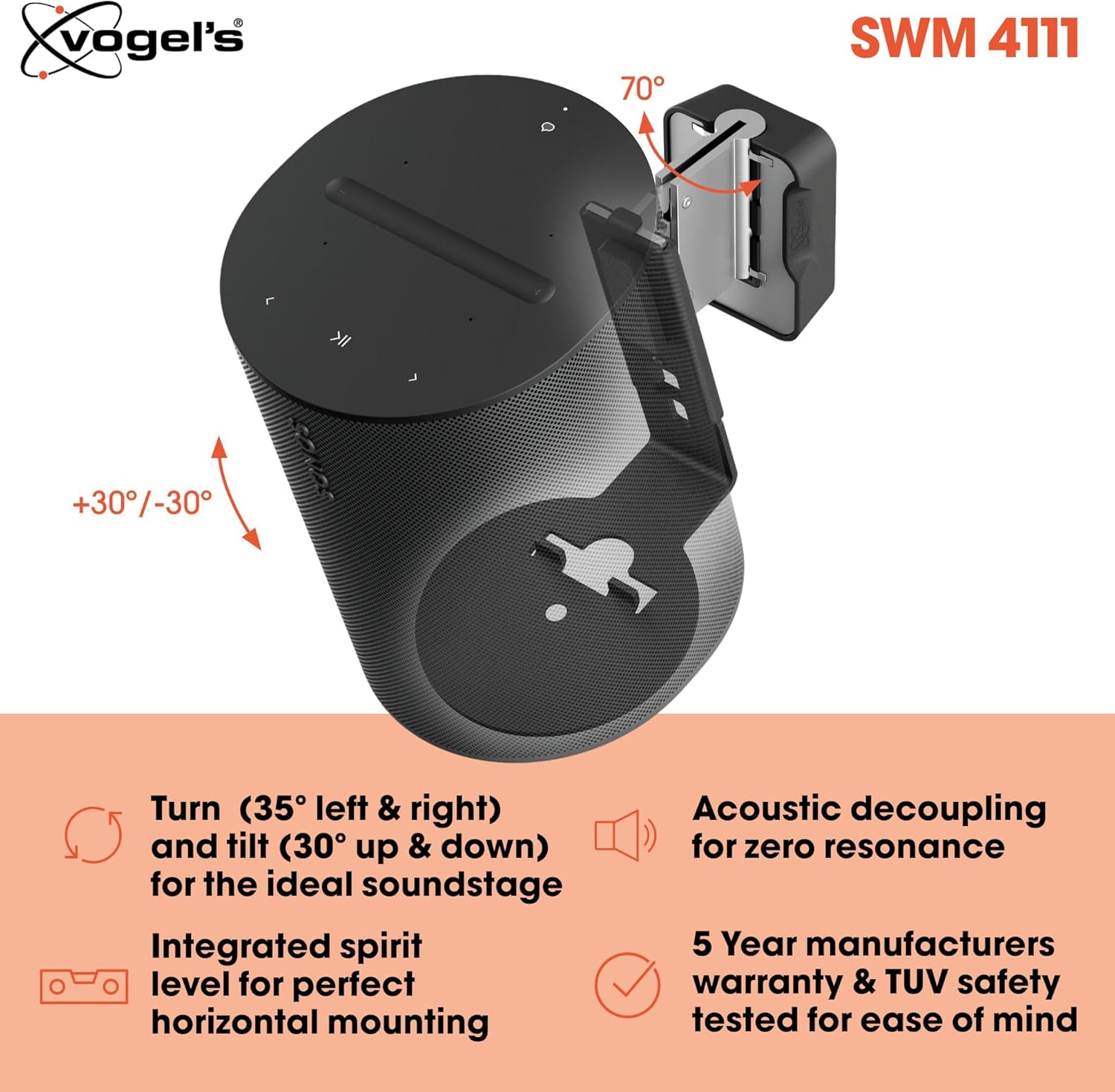 Vogel's SWM 4111 Speaker Wall Bracket for Sonos ERA 100, Max. 11 lbs (5 kg), Tiltable -30º/+30º, Swivels up to 70º (Left/Right), Black, 1 Bracket