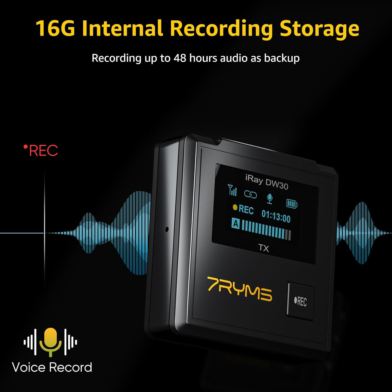 - ă16G Internal Recording StorageăThe iRay DW30 Wireless lavalier microphone with 16 GB internal storage, record up to 24 hours of audio as backup. Ensure the integrity of the recording data without worrying about losing audio.