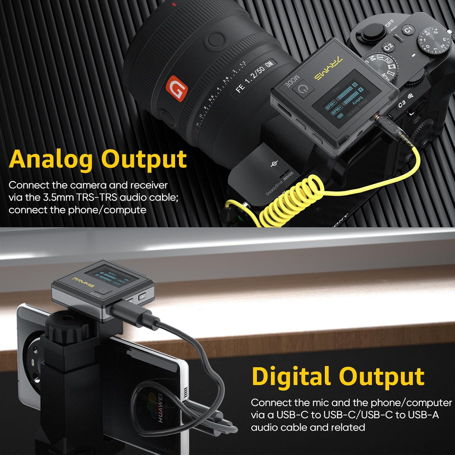 - ăTwo Audio Signal Output MethodsăThis iRay DW30 lav mic has both digital output and analog output as output modes. Using different connectors to get the different audio signal modes. Choose the right output mode according to the usage scenario to get quality audio.