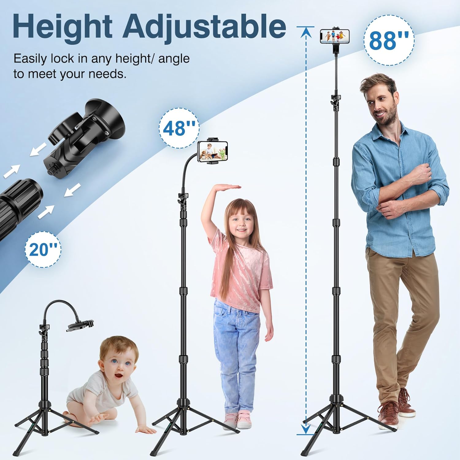- FLEXIBLE GOOSENECK TRIPOD: Starting your photography adventures with our phone tripod that extends from 20 to 88 inches. With a 15.7 inch flexible gooseneck, making it an excellent choice for capturing both low-angle and high-angle shots with precision