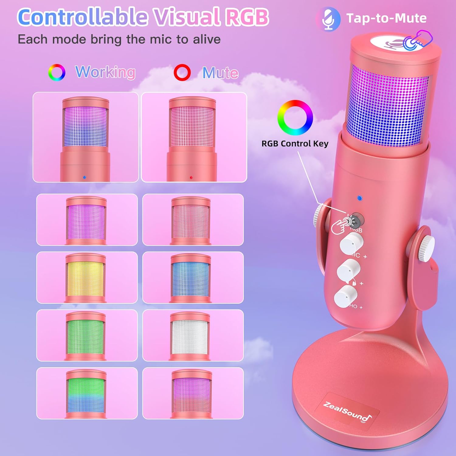ZealSound USB Gaming Microphone for iPhone PC Type C Phone,Noise Cancellation,K66 RGB Condenser Mic with Controllable Led Lights,Echo,Touch Mute,Monitor,Gain for Podcast,Gaming,Podcasting,ASMR (Pink)