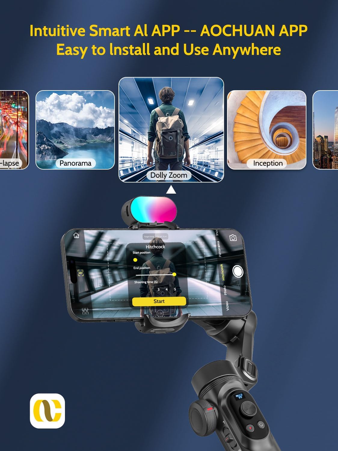 - [AOCHUAN SMART X Pro Gimbal kit Packaging List and Support] 1x AOCHUAN SMART X Pro Gimbal(black) (phone not included), 1 x Tripod, 1 x USB-C Charging Cable, 1x magnetic RGB fill light1 x User Manual.