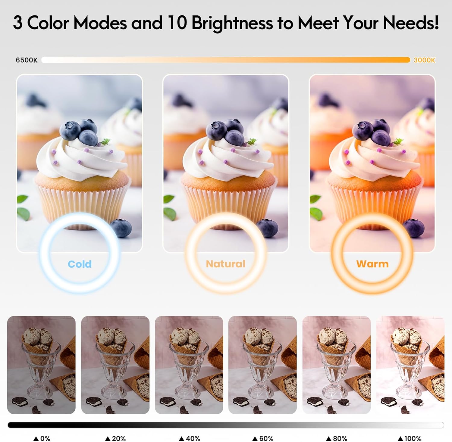 - 【3 Colors and 10 Brightness Levels】The LED ring light for phone offers three colors of light: white, natural, and yellow. With ten brightness levels, you can easily adjust the light's color and brightness based on your shooting content. This significantly enhances the quality of your photos and videos.Please connect more than 10W adapters, which can guarantee sufficient brightness.