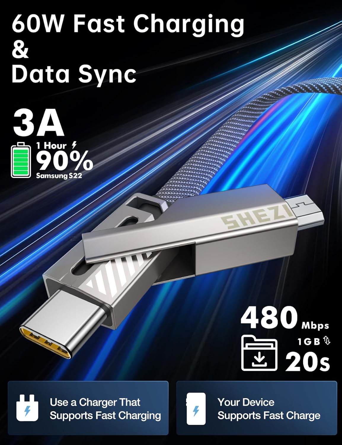 - 60W Fast Charging & 480mbp/s Data Transfer: 4-in-1 USB cable offers high-speed and safe charging up to 60W, enabling faster charging compared to standard cables. It can charge a Samsung S24 Ultra phone to 80% in 30 minutes (actual speed depends on your device and charger). The cable supports data transfer at 40-60MB/s, allowing a 1GB file transfer in 20 seconds. Compatible with iPhone, Samsung, tablets, Air, Mini, Pro, MacBook, and more, this cable saves time and enhances efficiency