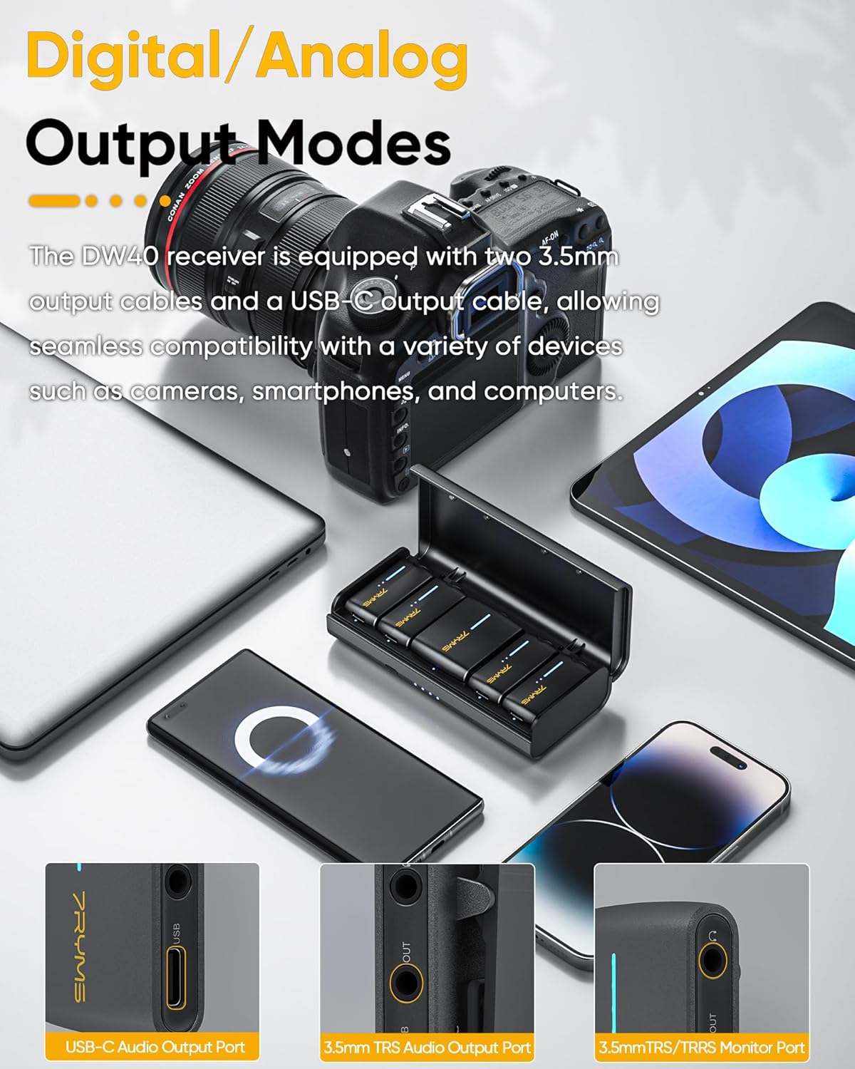 - ăDigital/Analog Output ModesăThe DW40 wireless lavalier microphone offers USB C digital and 3.5mm analog output options. You can use this microphone kit to be compatible with a variety of cameras, smartphones, and computers, providing versatility for different recording scenarios.