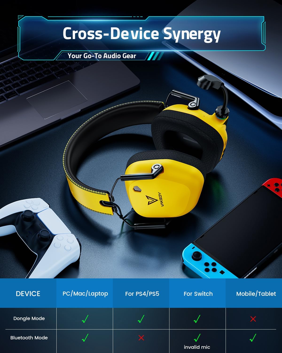 Wireless Gaming Headset for PC, PS5, PS4, Mac, Switch, 2.4GHz USB Dongle Wireless Gaming Headphones with Microphone, Bluetooth 5.4, 50mm Driver, Stereo Sound, Cool Lighting, 50H Battery-Yellow