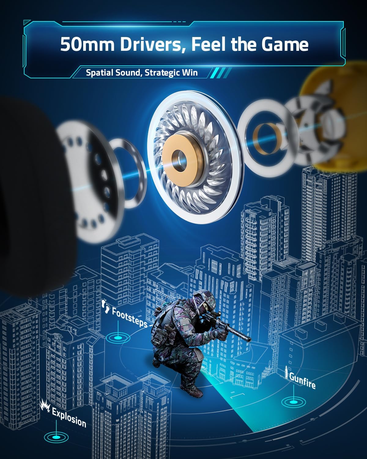 - ใ๐๐ข๐ซ๐๐ฅ๐๐ฌ๐ฌ ๐ ๐ซ๐๐๐๐จ๐ฆ, ๐๐ฆ๐ฆ๐๐ซ๐ฌ๐ข๐ฏ๐ ๐๐ซ๐๐๐ข๐ฌ๐ข๐จ๐งใUnleash the full potential of gaming with our 2.4GHz ultra-low latency wireless gaming headset, offering up to 49 feet of unrestricted movement in unobstructed spaces with imperceptible latency (โค20ms) for a smoother gaming experience. Combined with a 50mm dynamic coil driver, allowing you to clearly perceive directional sounds, footsteps, and every detail in the game for an immersive gaming world