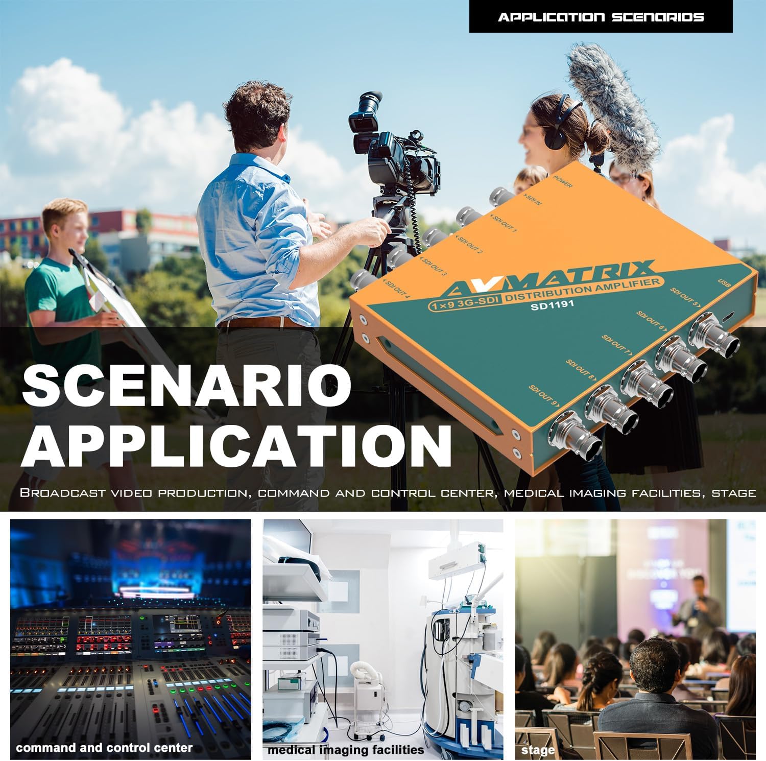 - 【9 Ouptput, 1 Inputs, Auto Detechable】SD1191 is a compact, one input, nine output distributionamplifier for SDl and multi-rate SDl video signals up to1080P 60hz(2.97 Gbps). input support Auto detech HD/ SD/ AG-SDI Signal, Outputs support DVB-ASl signal