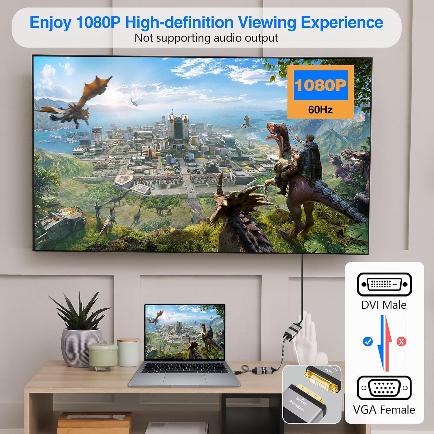 - 1080P UHD Resolution:Our DVI to VGA adapter supports up to 1080P@60Hz and backwards compatibility 720P. More precise visual effects than 720P, making it an ideal choice for high-intensity gaming and movie immersion.
