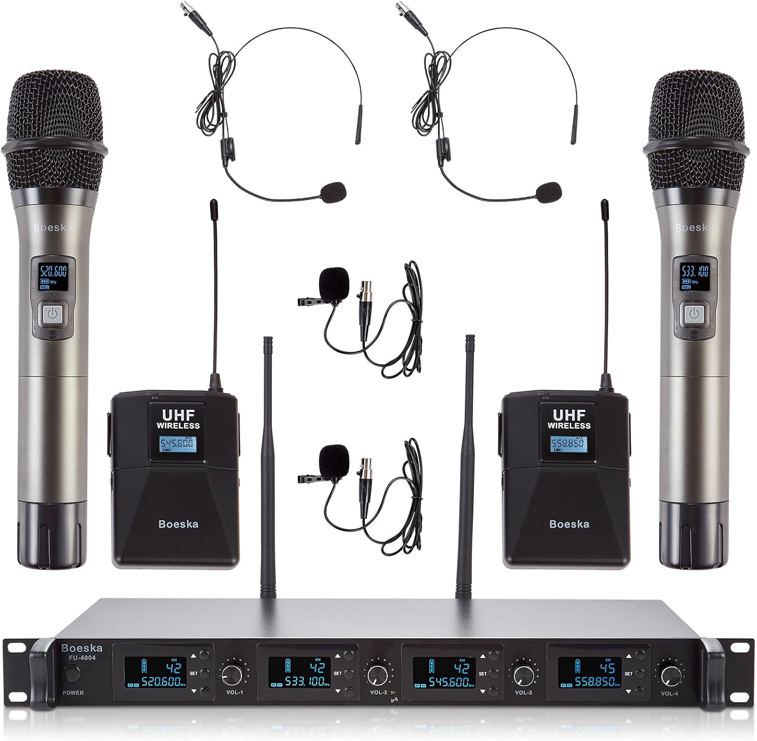 4 Channel Wireless Microphone System UHF 2 Cordless Handheld Mics and 2 Lavalier Headset Mics for Karaoke Church Speaking Conference Meeting Party, 4x25 Adjustable Frequency (2 Handheld + 2 Bodypack)