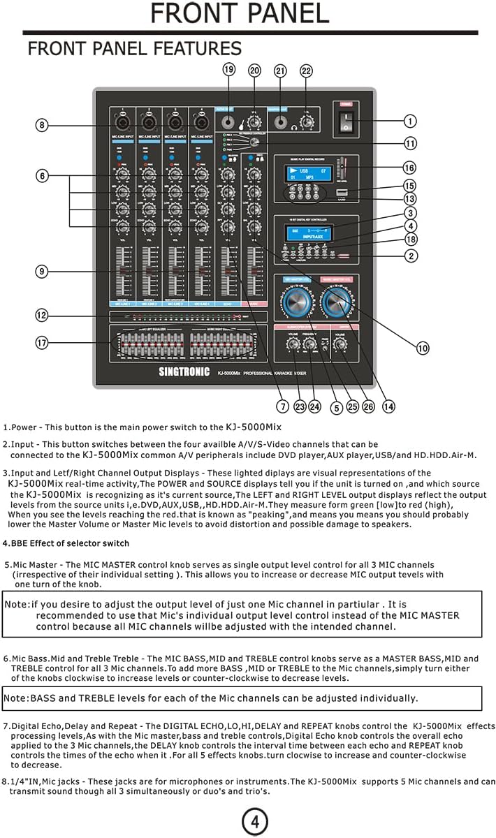 - Microphone Volume Controls for Low, Mid, High, Echo, Volume for individual microphones