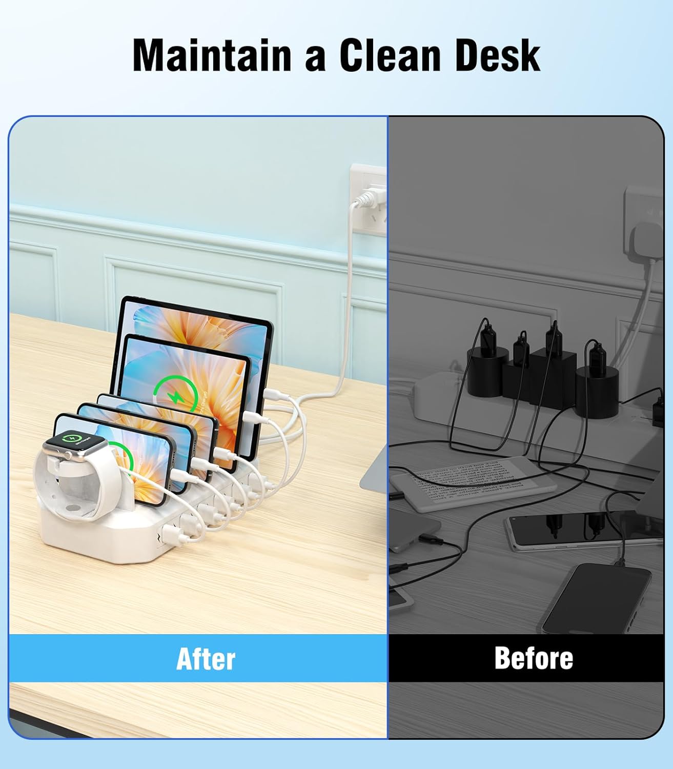 - γSmart and Practical DesignγThis USB charging station features a well-thought-out design, optimized for use in homes, offices, meeting rooms, living rooms, bedrooms, kitchens, hotels, and classrooms.The iphone and watch charging station compact and organized layout ensures a convenient and clutter-free charging experience wherever you need it