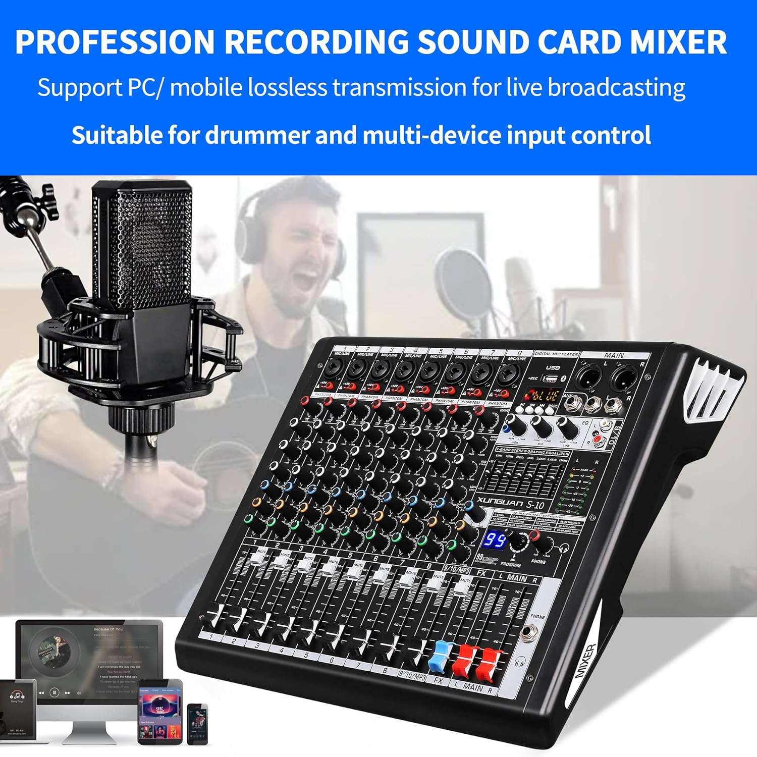 S-10 Audio Mixer 10 channel 8 channel Professional DJ Mixing Console with Reverb MP3 Player Bluetooth 48V Phantom Power Supply USB Recording for Studio Karaoke Live Music