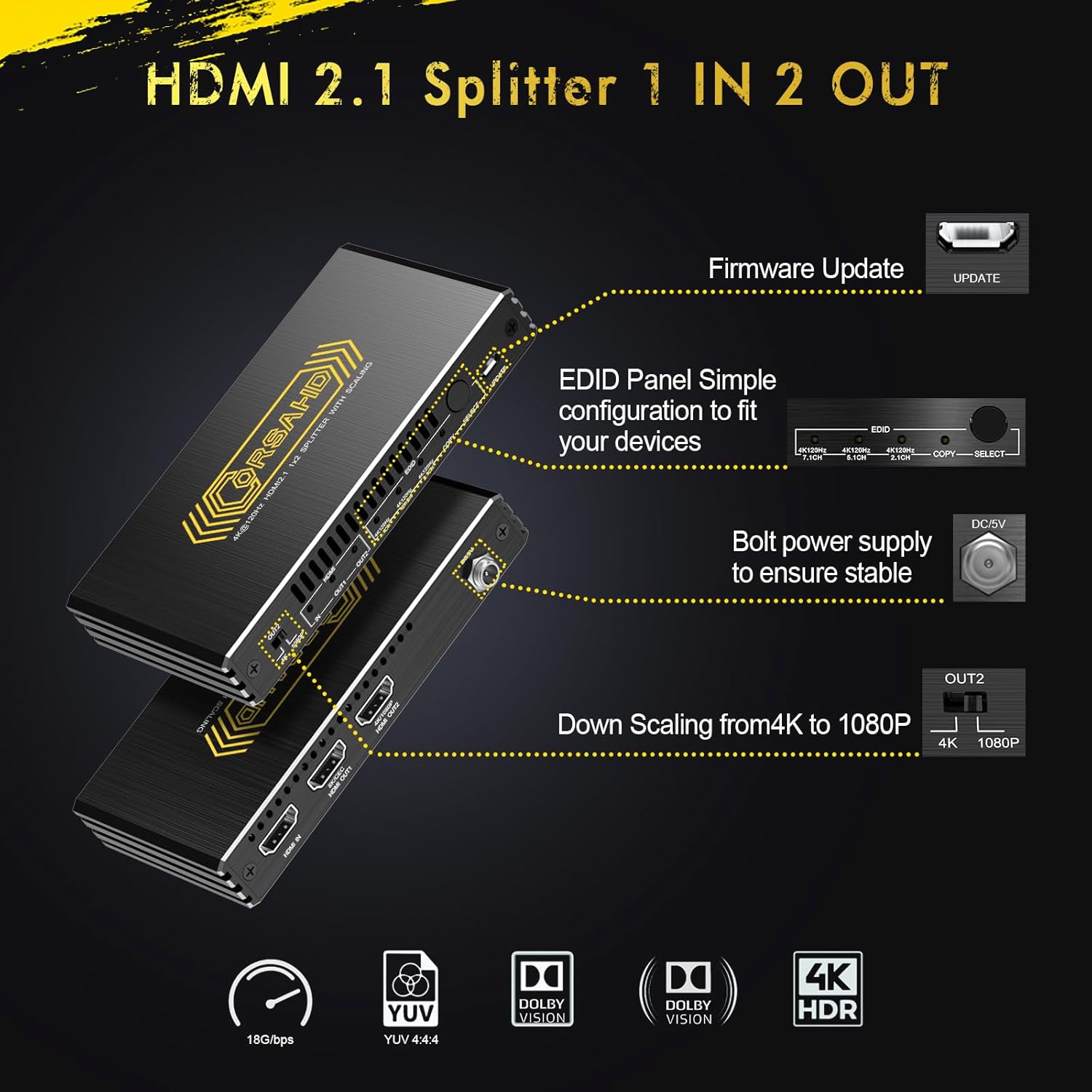 - ✨【8K HDMI 2.1 Splitter 2x1】 -- CORSAHD HDMI 2.1 Splitter can easily duplicate/mirror 1 HDMI source to 2 displays simultaneously. Supports HDCP 2.2 bypass. Comes with EDID management,Down scaler function. Works great with PS5, XBOX series, Nintendo Switch, etc..