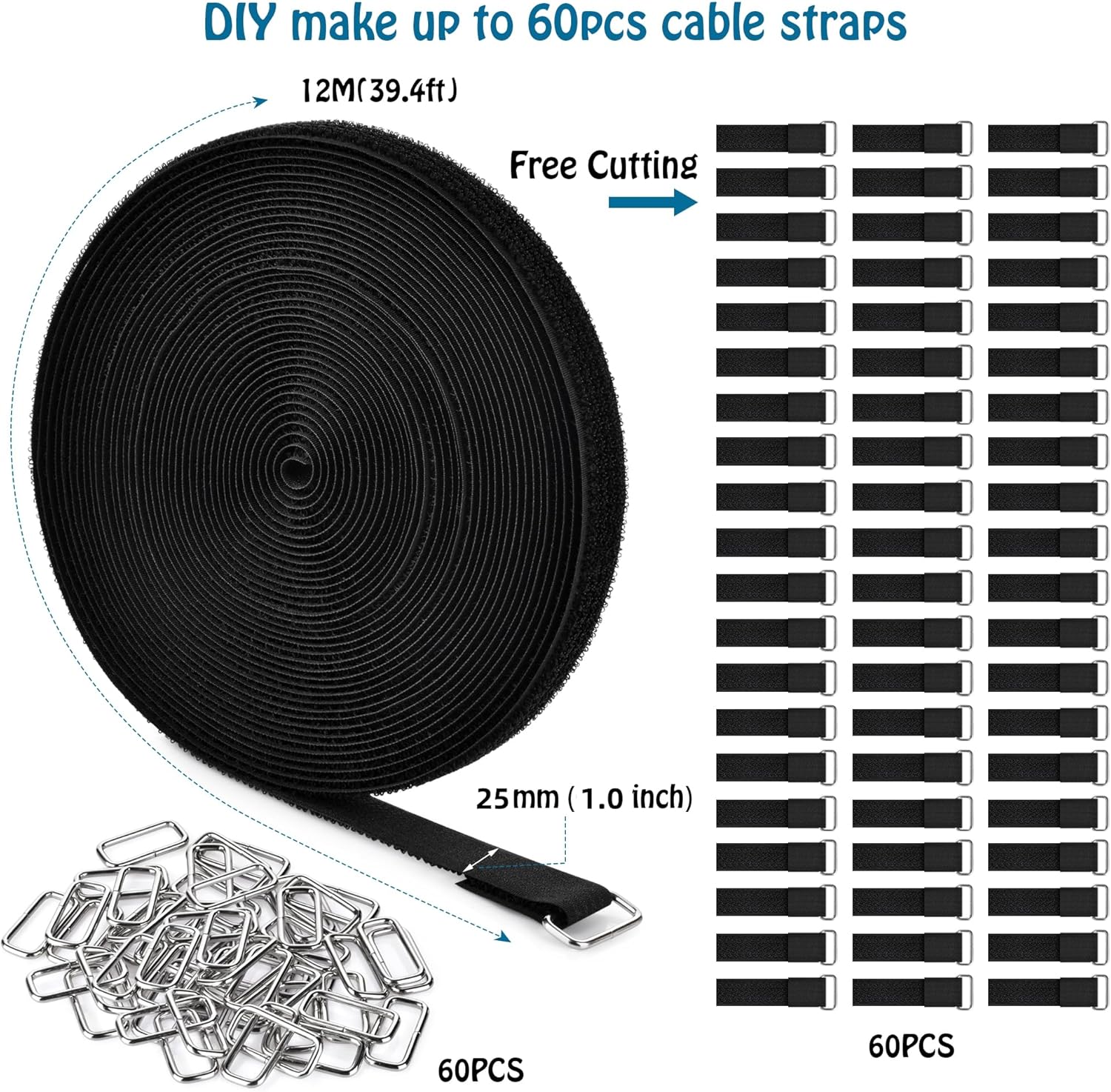 1"x39.4ft Hook and Loop Straps with 60 Buckles Adjustable Cut-to-Length Cable Ties Roll- Reusable Nylon Fastening Tape Cable Straps for Storage or Organization (1in x 39.4ft)
