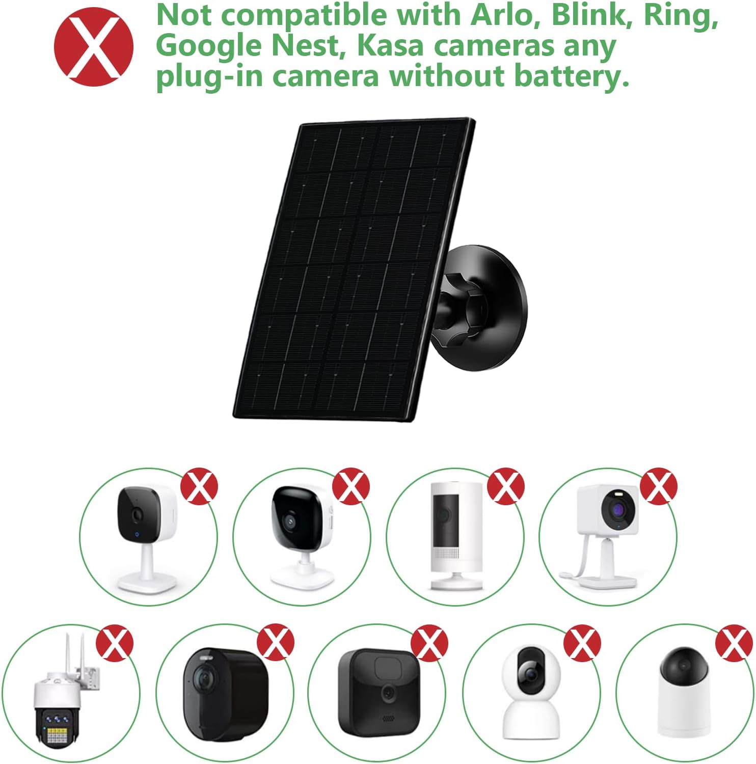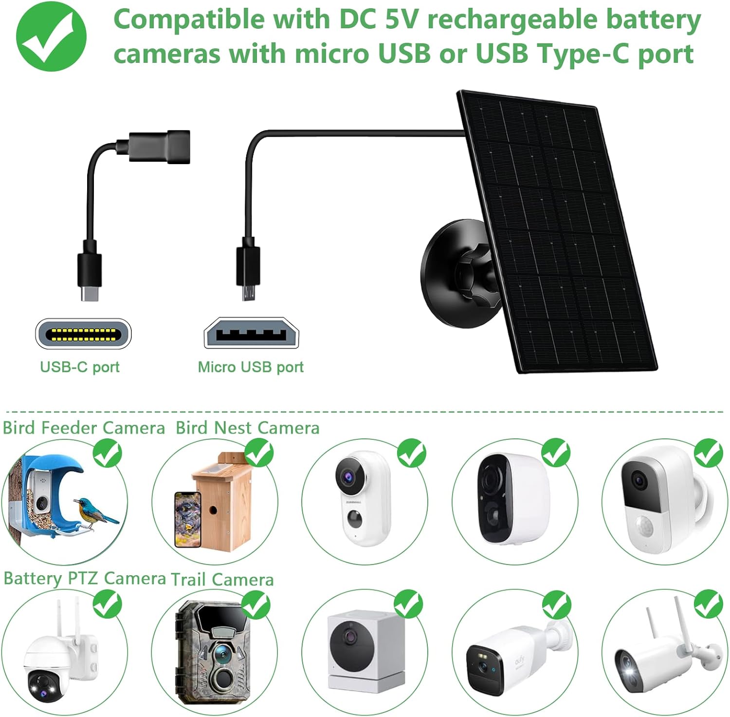 - Compatibility - Our 4W usb solar panel charger is specifically designed for DC 5V rechargeable battery cameras with micro USB or USB Type-C ports. Please note that this security camera solar panel is not compatible with Arlo, Blink, Ring, Google Nest, Kasa cameras, or any plug-in cameras without batteries.