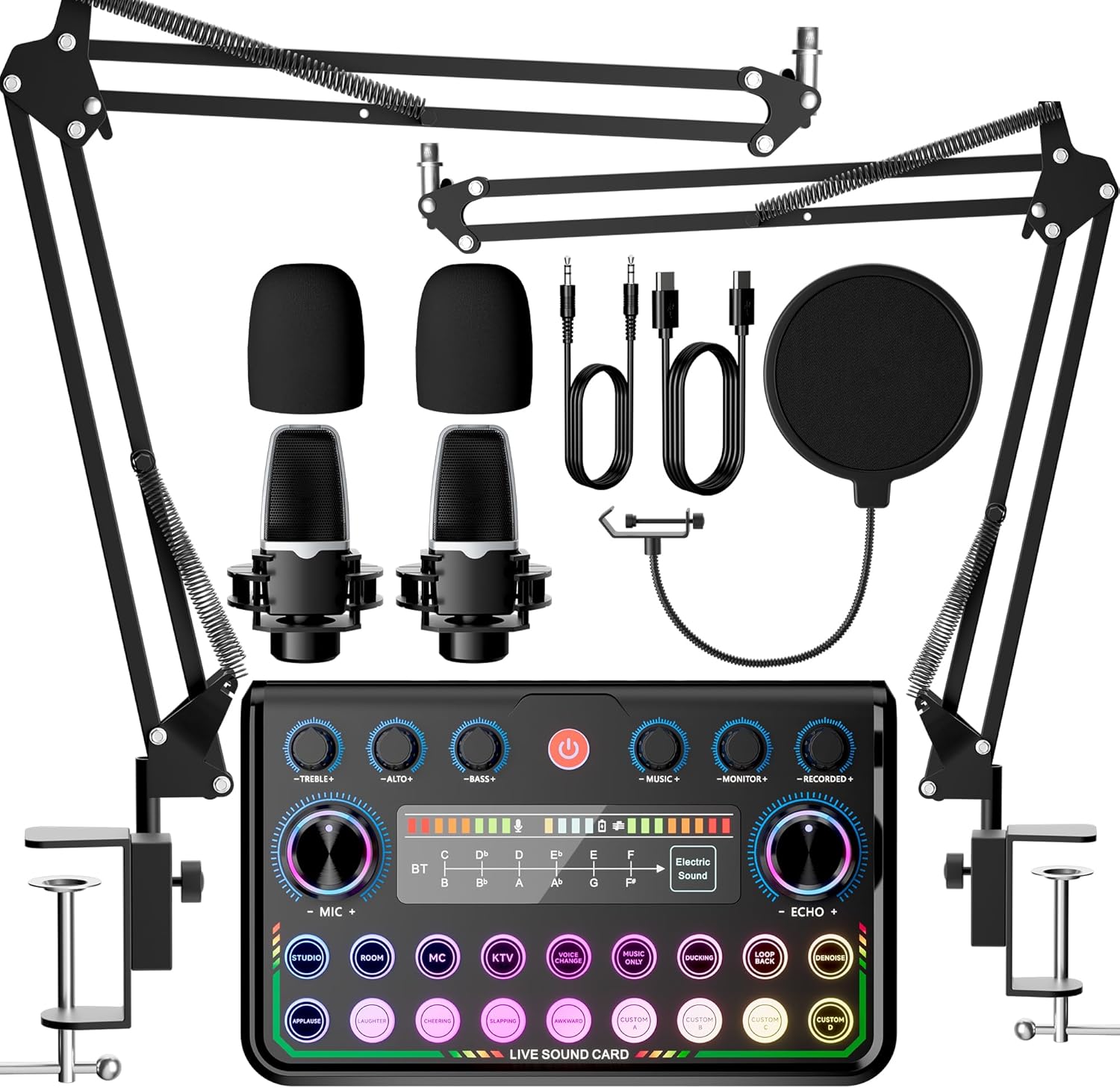 - Support for 2 People Live Streaming:This Podcast Equipment Bundle for 2 is specially designed for two people live streaming or recording. The functions on the audio mixer can fully meet the needs of daily live broadcasting. Equipped with 2 condenser microphones, 2 Double-Layer Pop Filter, 2 adjustable suspension scissor arm stand, 2 Shock mount, 2 Anti-wind foam Cap, Power cable, Live sound card. You can use standing, sitting, find the best use angle for you.