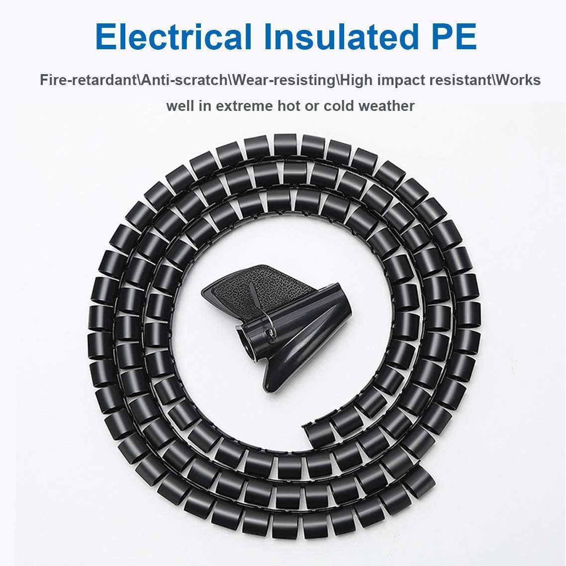 - Electrical Insulated PE:Made of durable & expandable halogen free PE material which is high density,anti-scratch and fire-retardant,works well in extreme hot or cold weather(-60C to +85C).Electrical insulated material allow you to safely manage your cables and cords and keep your kids or pets away from electric shocks.PE is stronger and more impact resistant than other plastics,can protect the cords from tearing,foot traffic and pet chewing,allow bundling multiple cables without deformation