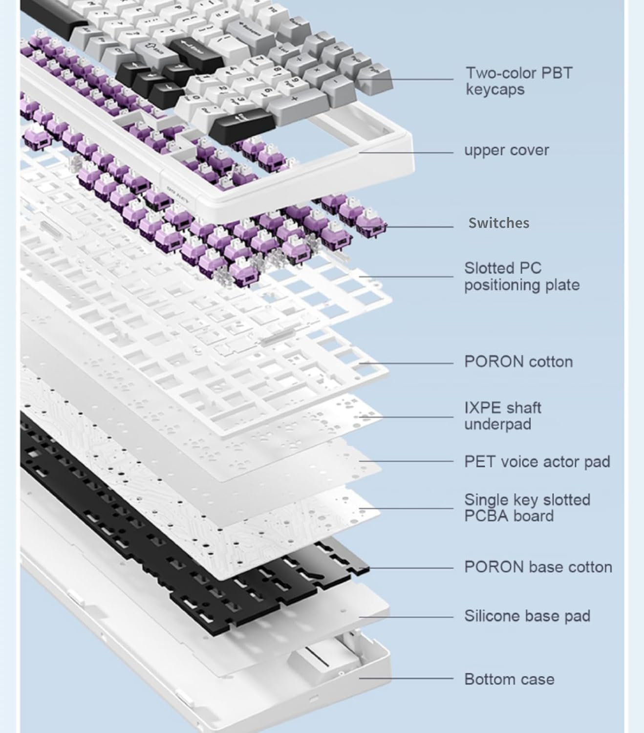 - Creamy Keyboard: Equipped with 5-layers of sound deadening material to enhance typing sound. The combination of sandwich foam, IXPE switch pads, PET acoustic membrane, bottom foam, and silicone protector pads help eliminate echoes, providing a pure typing sound and a stable, comfortable typing feel