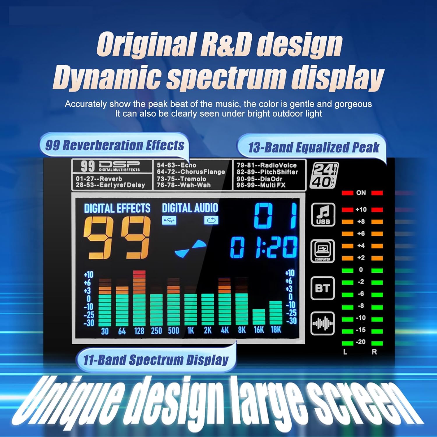 - 【99 DSP Effect Processor】Switch between 99 professional effects including Hall reverb, tape echo and vocal booster. Save 9 custom presets for instant calling on the live show. Ideal for creating arena-style acoustic effects in church or adding depth to podcasting recordings