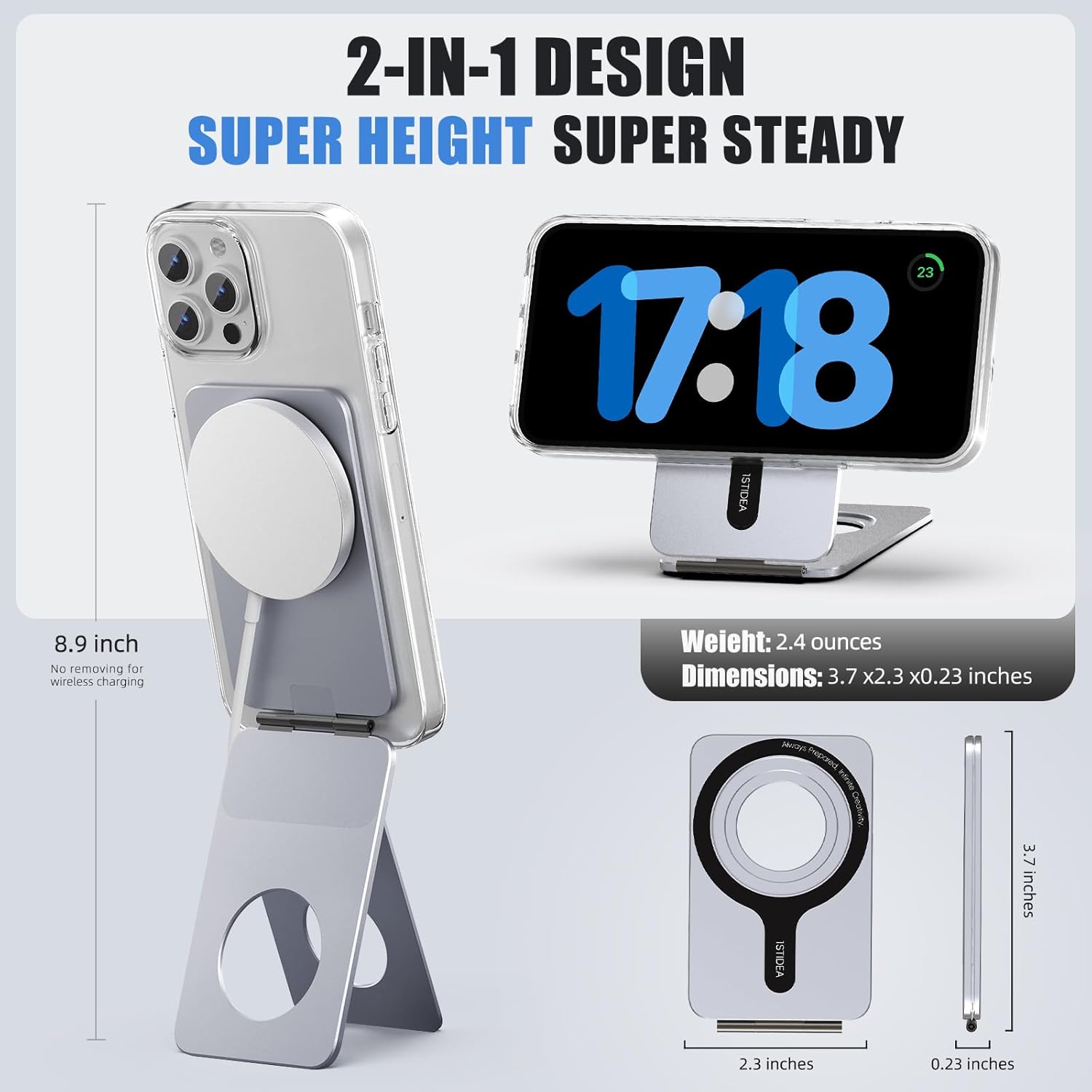- Phone Stand with Stylish Design: The cell phone stand is made of new generation aluminum alloy, and the tripod stand design makes the product more stable. The hinge is solid and reliable, adjustable multiple angles. It must be used in accordance with the following ways for the magnetic to be the strongest 1.Use phone compatible with MagSafe function 2.If your phone not compatible with MagSafe, use compatible with MagSafe phone case or with our metal ring