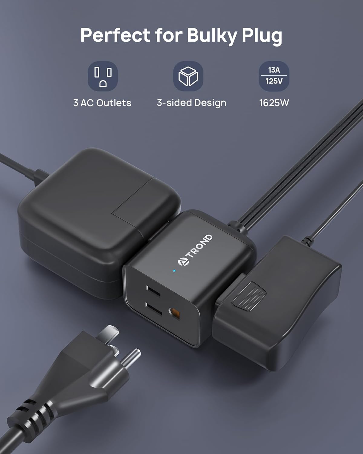 - Sleek 3-Sided Power Cube: Unlike traditional extension cord strips, the smart-looking electric black extension cord features 3 grounded outlets on different sides, allowing you to use bulky plugs without blocking adjacent outlets and the black color blends well with dark decor. Max 1625W (125V/13A)
