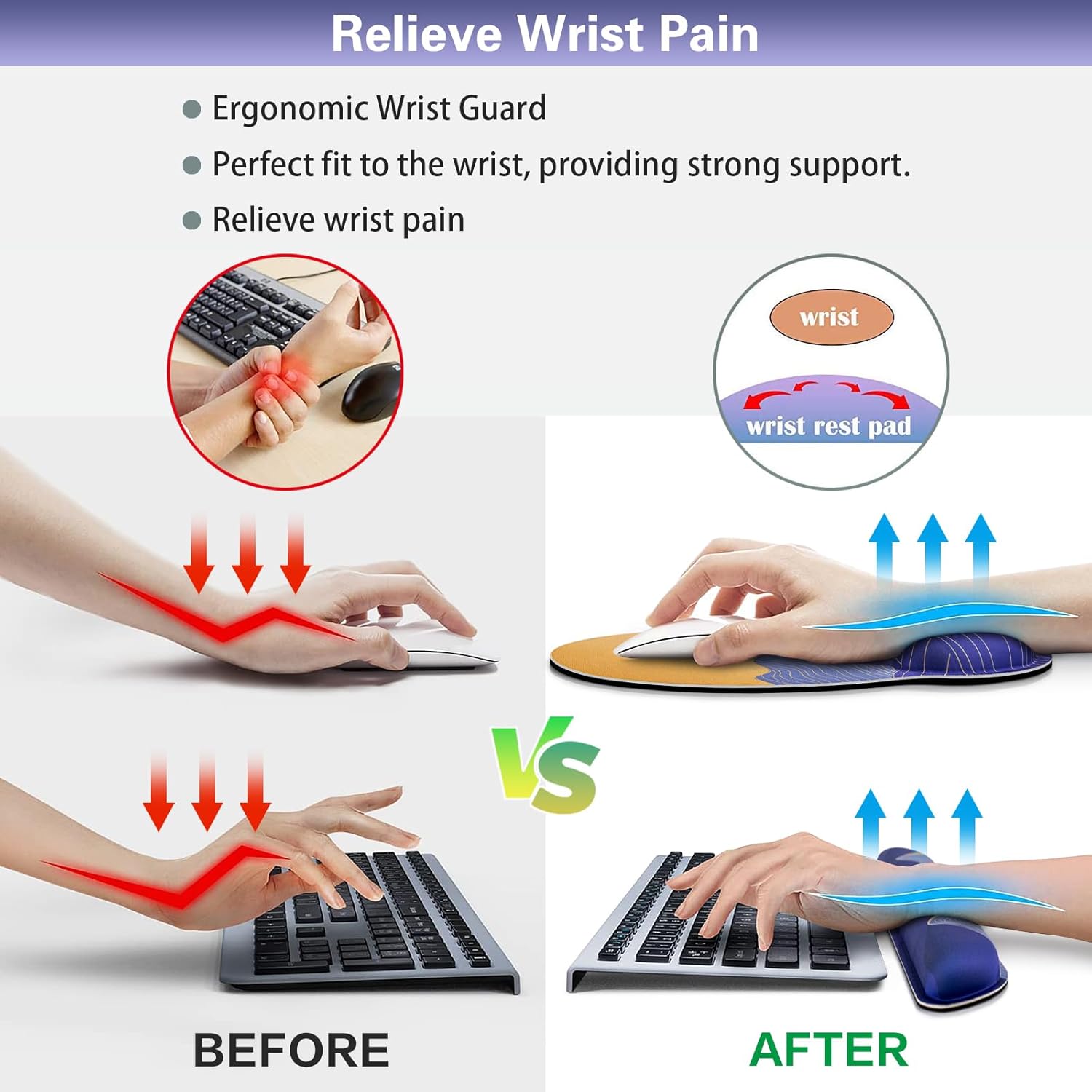 - 【Ergonomic Mouse Wrist Rest Pad】-The mouse pads for desk with wrist support are designed to be ergonomic wrist support,made of soft memory foam padding,which rebounds slowly,providing comfortable support for your wrists and hands,alleviating wrist pain,preventing carpal tunnel syndrome,and is very suitable for long-term use.