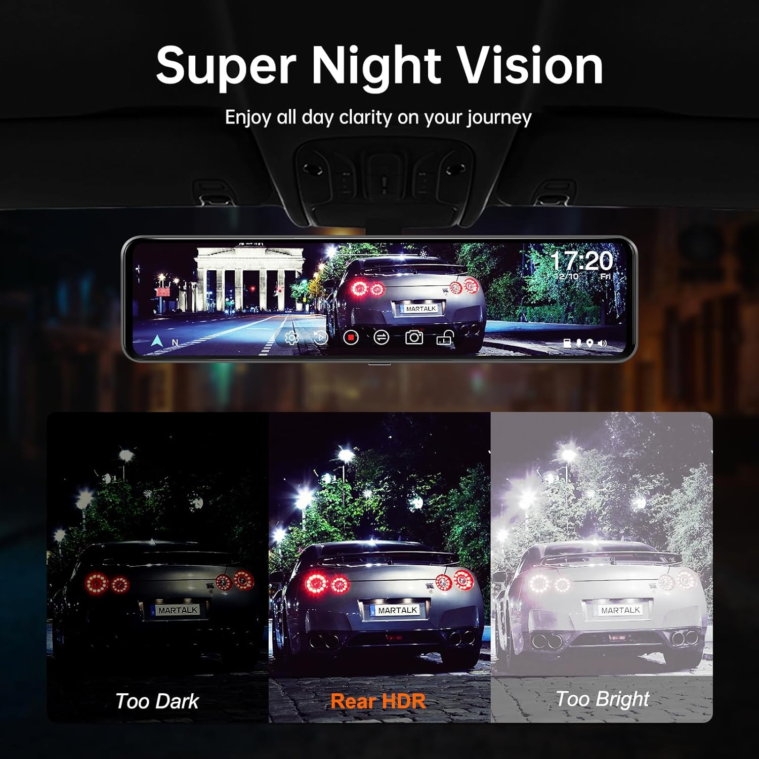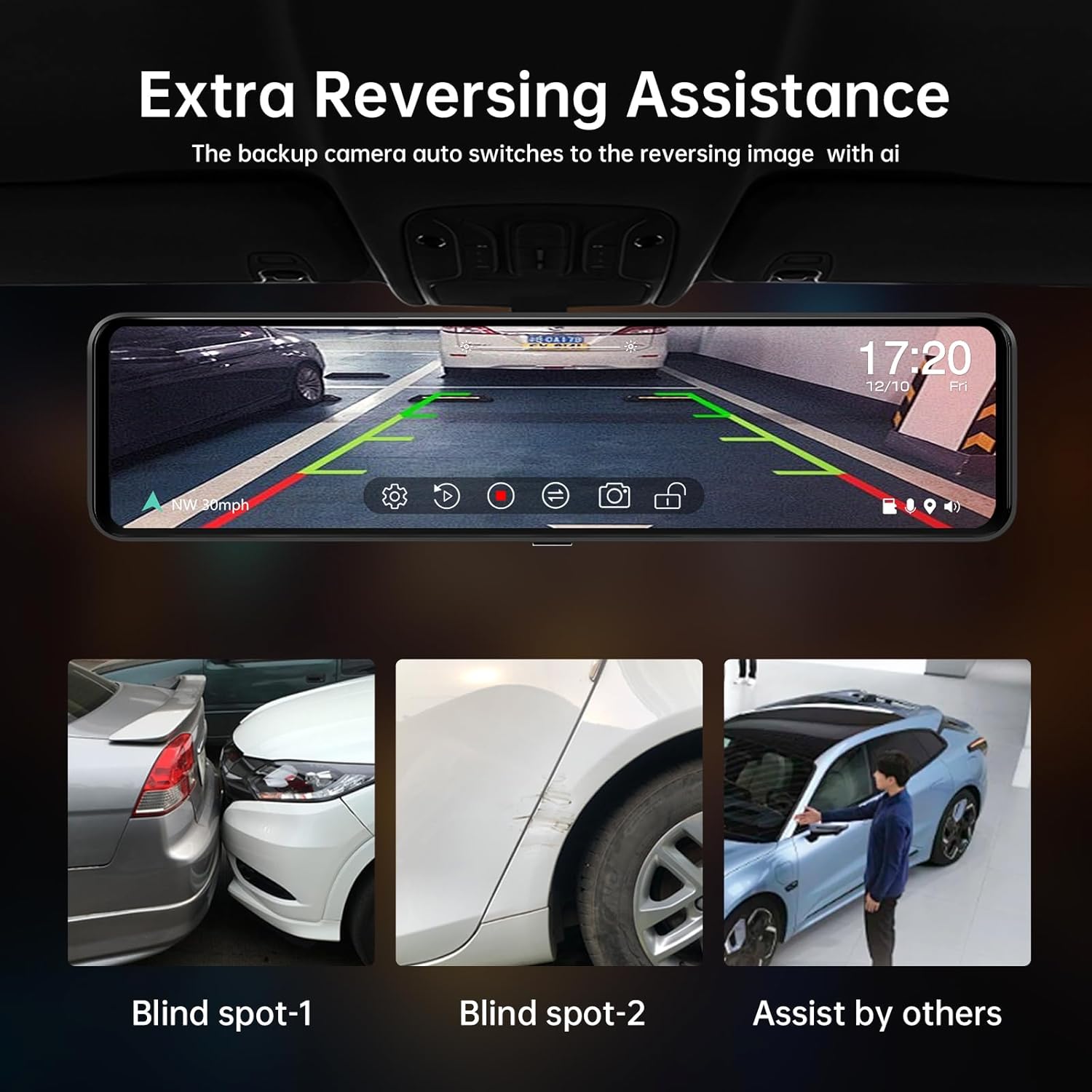 - [12" IPS Screen – Expansive View with Stunning Clarity] Boasting a 12" IPS LCD screen, it's a perfect fit for 98% of cars. As a front and rear digital mirror dash cam, it covers 5 lanes behind the vehicle. The visibility angle is 30% better than 11" mirrors. With enhanced power port charging, durability, and heat resistance, issues like power off, restart, and high-temperature deformation are things of the past