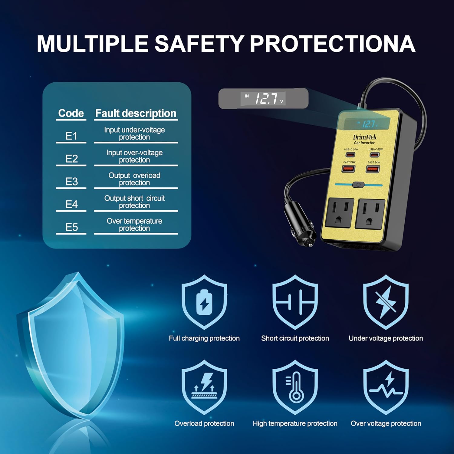 - Improve the safe charging technology,there are overcharge protection,short circuit protection,temperature control,undervoltage charging,overvoltage and overload protection,ABS housing is fully insulated.Note:Avoid using electronic products with a working peak of more than 300W like a hair straightener,and the working peak power is more than 300W.It will trigger the overload protection of the car inverter.