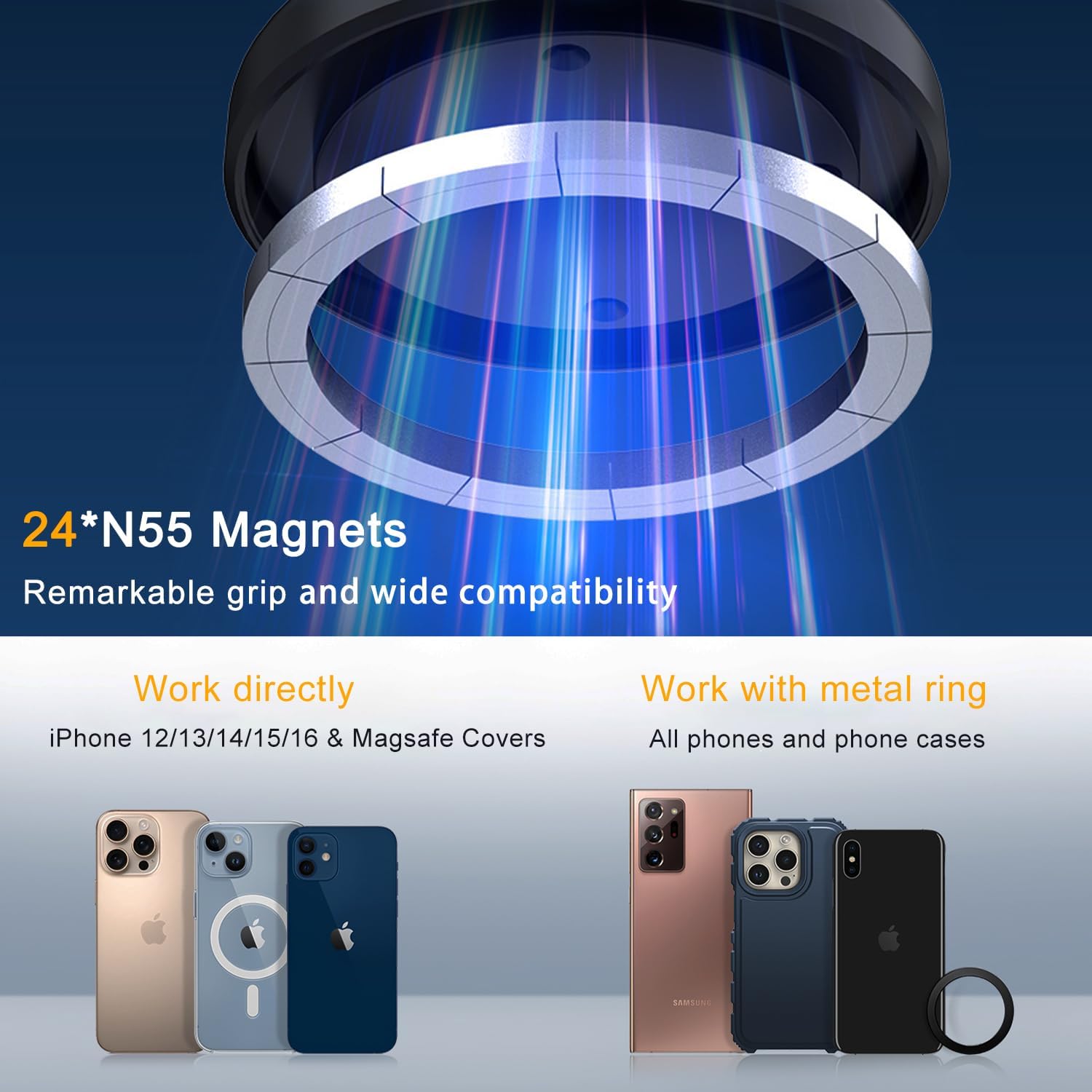 - Compatible Phone Models : Compatible with iPhone 12/13/14/15/16/16e Mini, Plus, Pro, Max; Magsafe Covers; Samsung Galaxy S20/21/22/23/24+, Ultra, FE; Android phones with metal ring Compatible with iPhone 12/13/14/15/16/16e Mini, Plus, Pro, Max; Magsafe Covers; Samsung Galaxy S20/21/22/23/24+, Ultra, FE; Android phones with metal ring