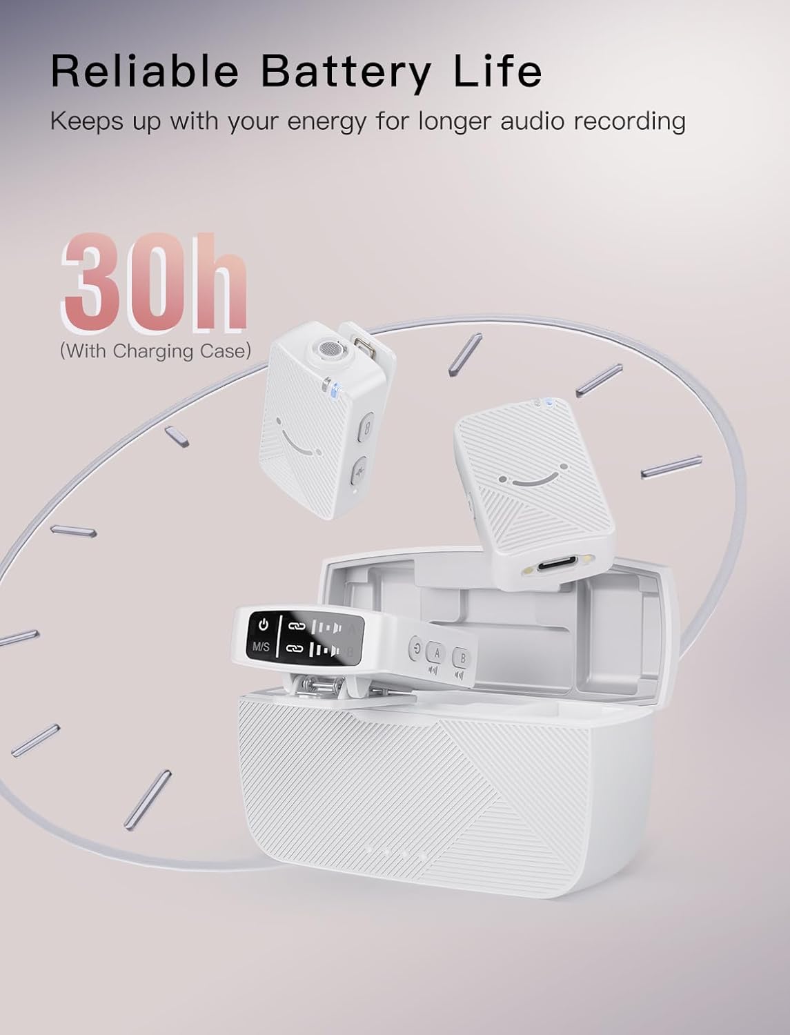 - [Enduring Battery, Extensive Range] The charging case fully powers the podcast lapel mic kit nearly 3 times, offering up to 30 hours of recording time. With dual-channel recording and the ability to charge while recording, you'll never miss a beat. With a working range of 164 feet, portable wireless microphone offers the flexibility to capture content from a comfortable distance.